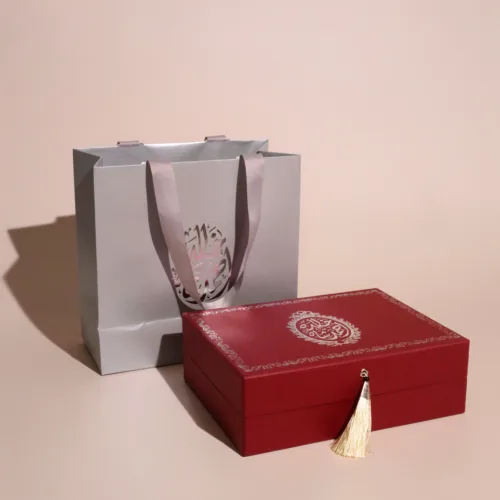 USD55A gift set including the holy Quran with an engraved name plate, pearl worry beads with Ayat Al Kursi engraved, two personalized pieces of chocolate, and a box of sugared almonds – in a customized gift box with a personalized message displayed inside the lid. -