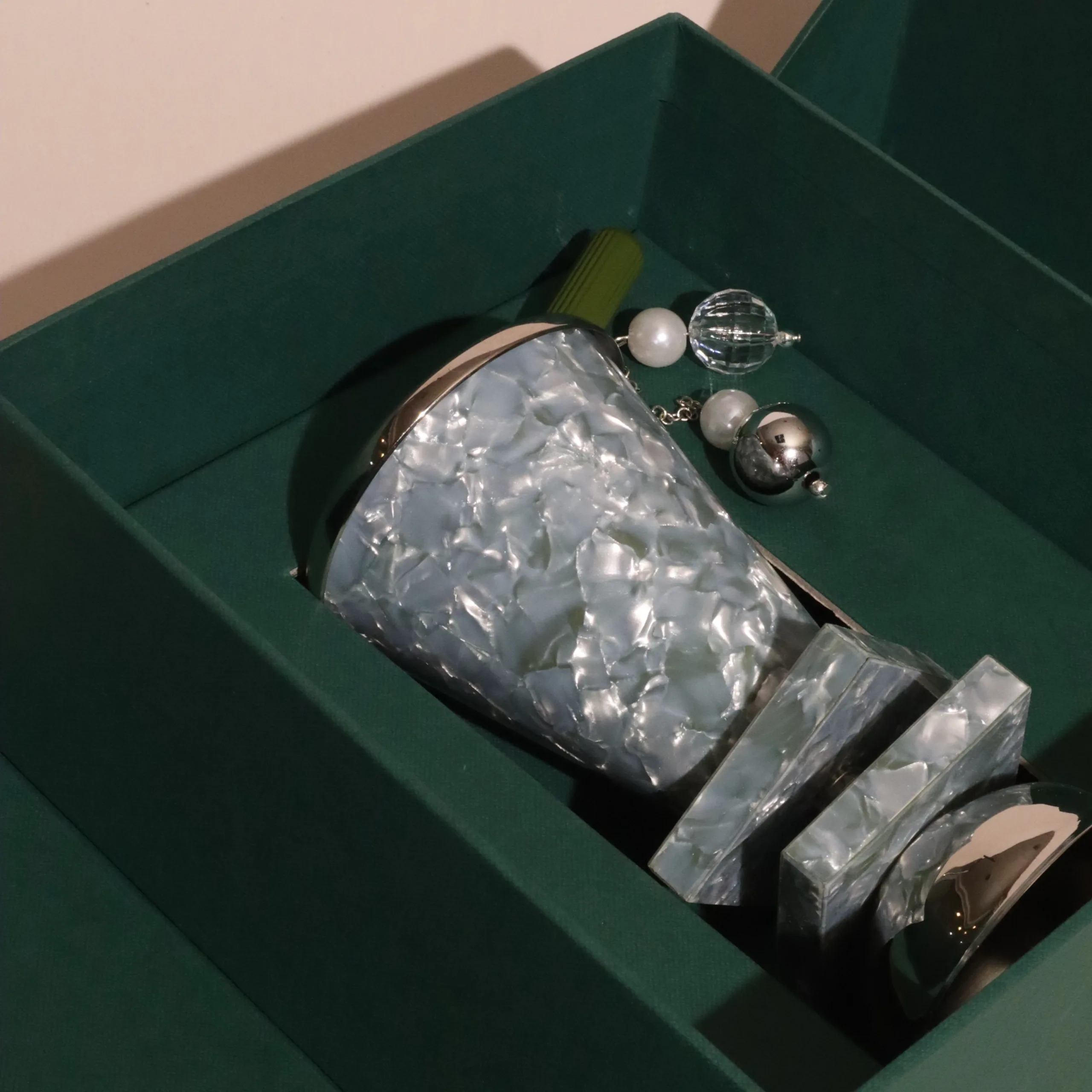 USD70A flower-shaped Murano incense burner in a geometric silver box with an embellished handle. -