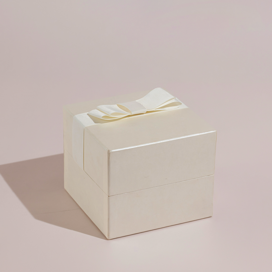 USD60A white Murano glass candle presented in a beige gift box with a see-through window. -