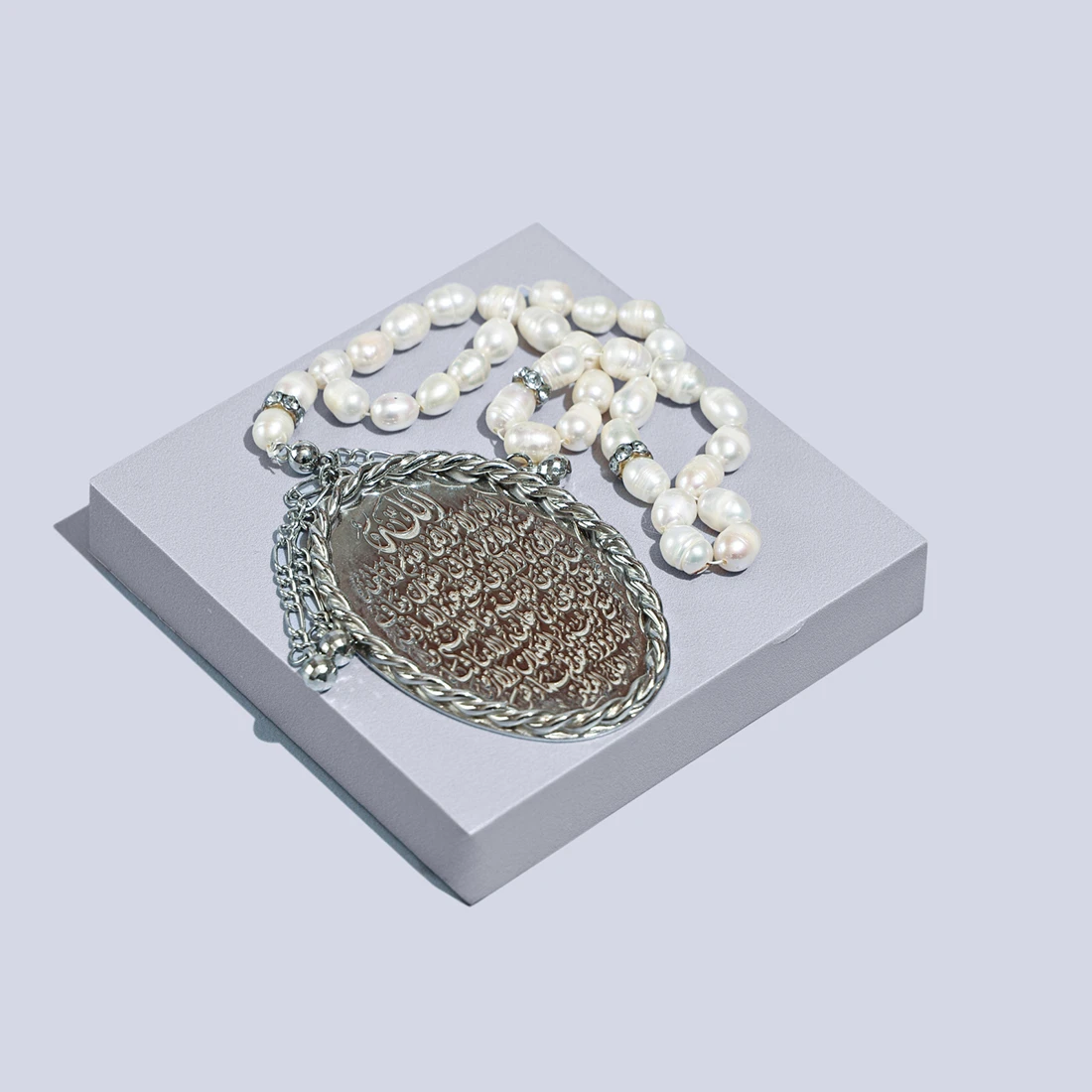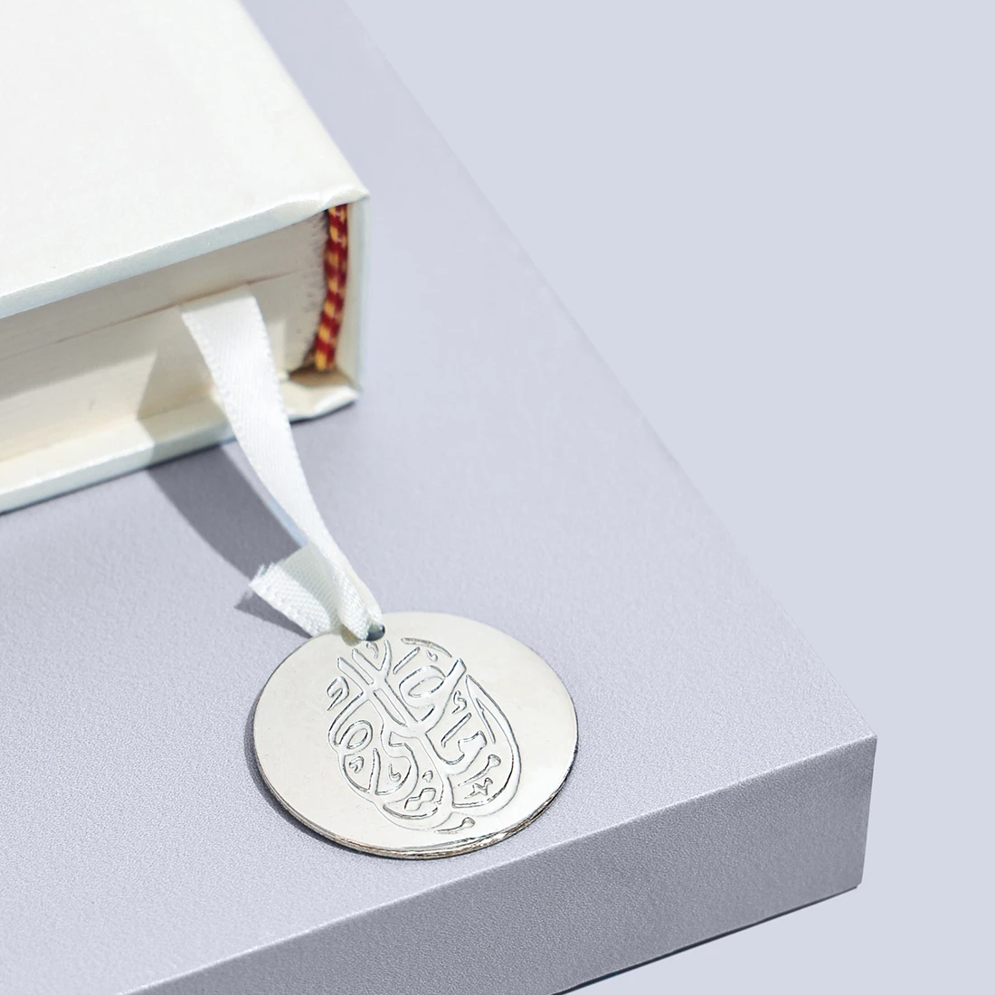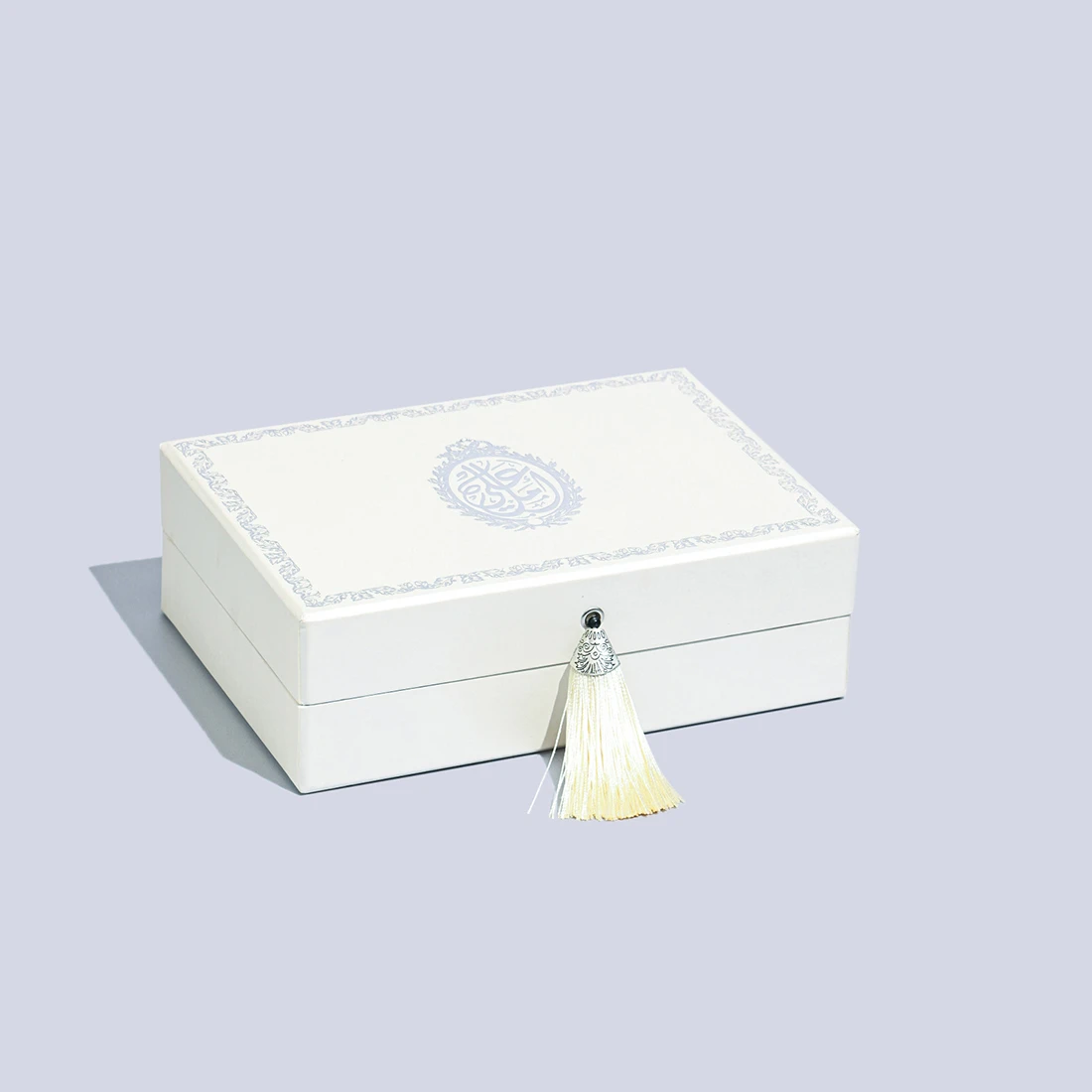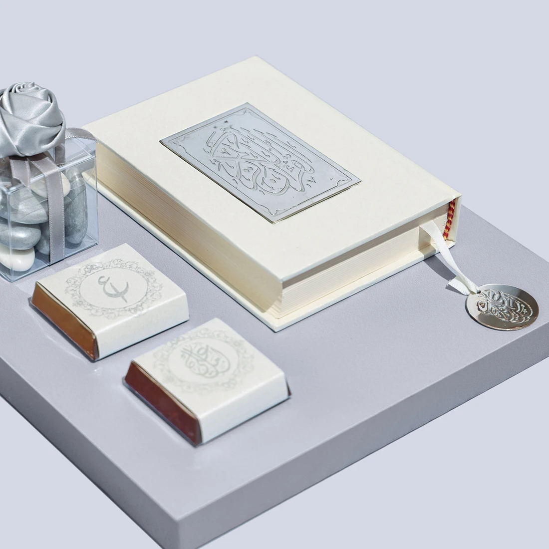 A gift set including the holy Quran with an engraved name plate, pearl worry beads with Ayat Al Kursi engraved, two personalized pieces of chocolate, and a box of sugared almonds – in a customized gift box.