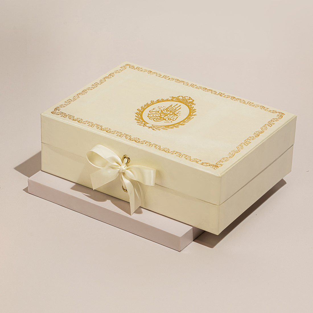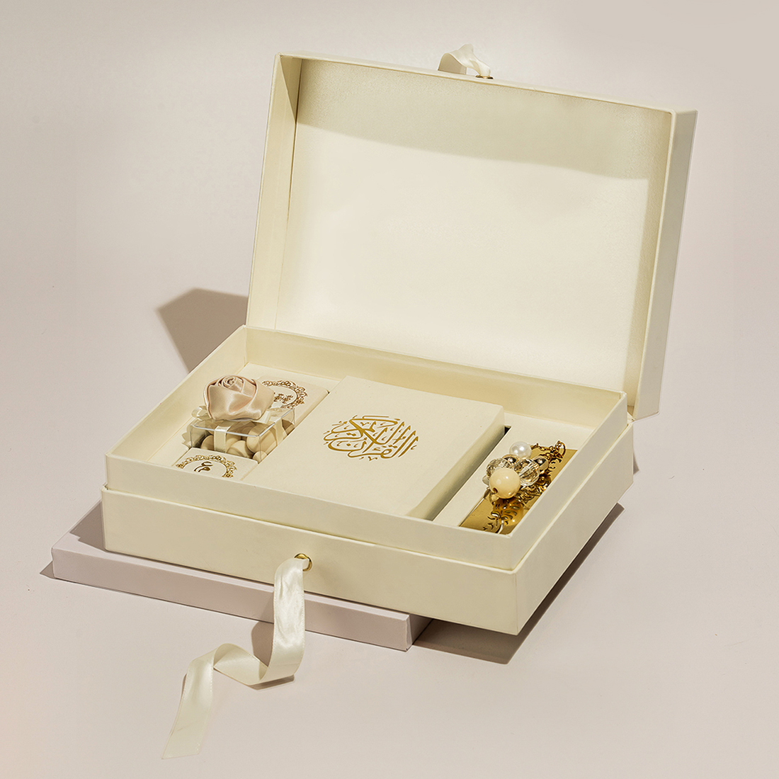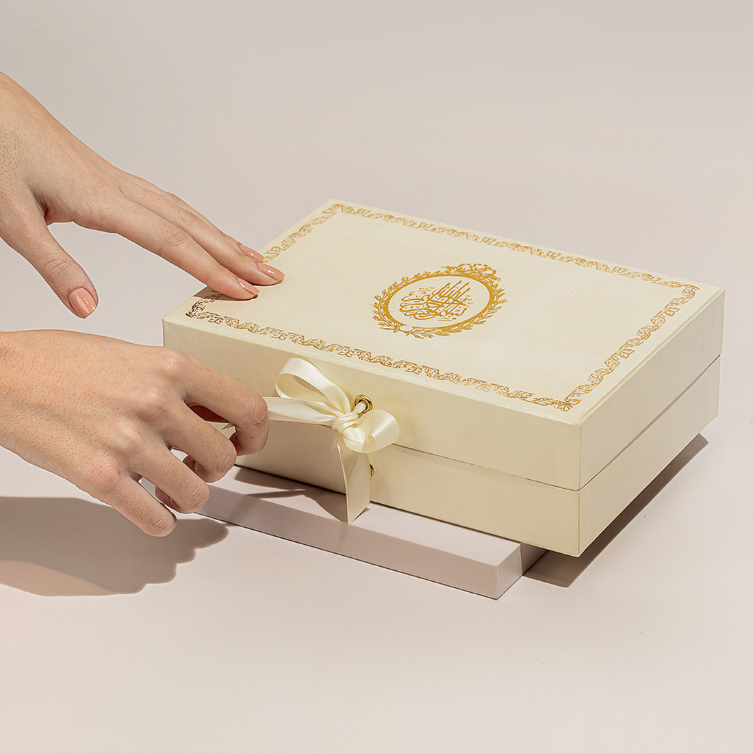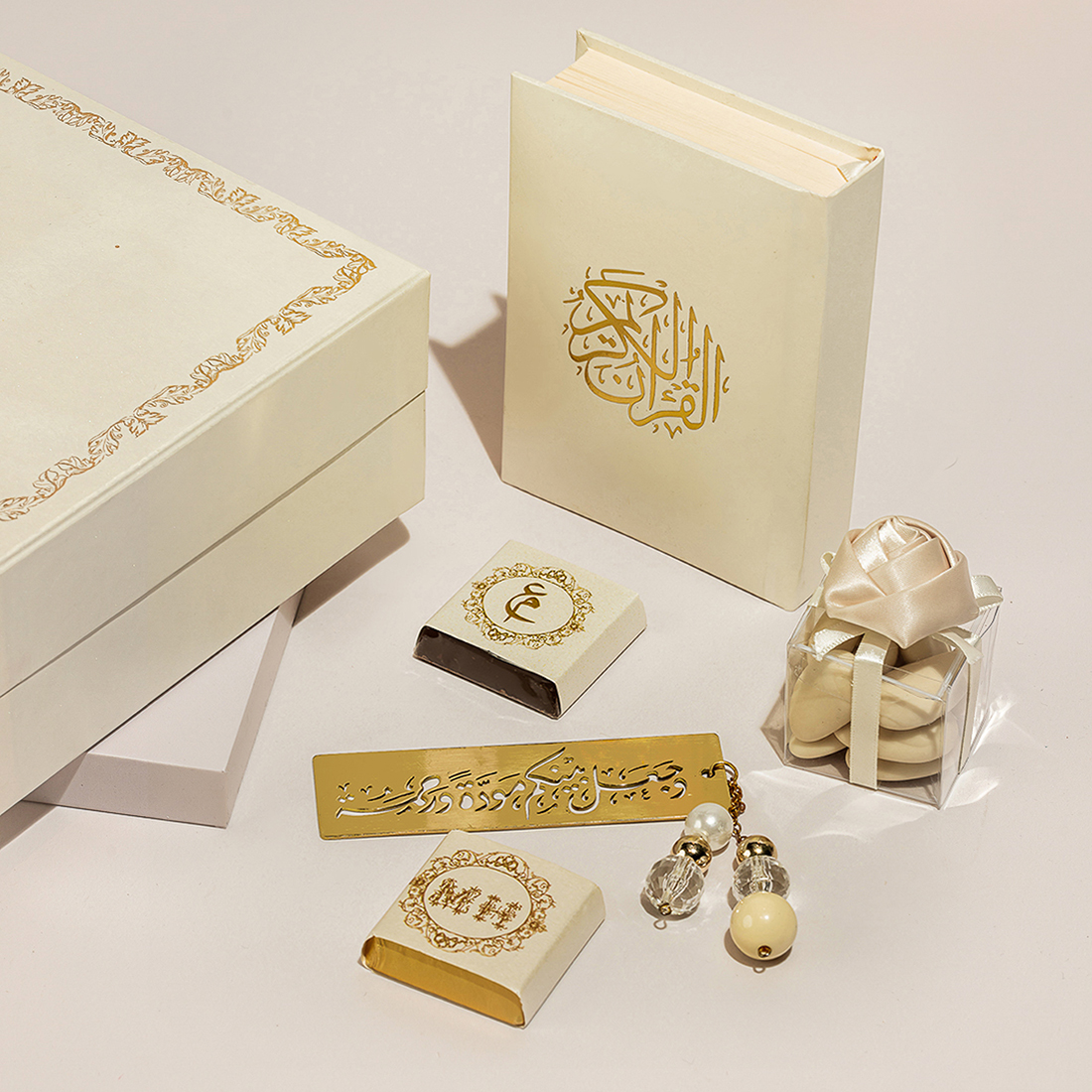 The holy Quran, an engraved bookmark, two personalized pieces of chocolate and a box of sugared almonds – all in a customized gift box