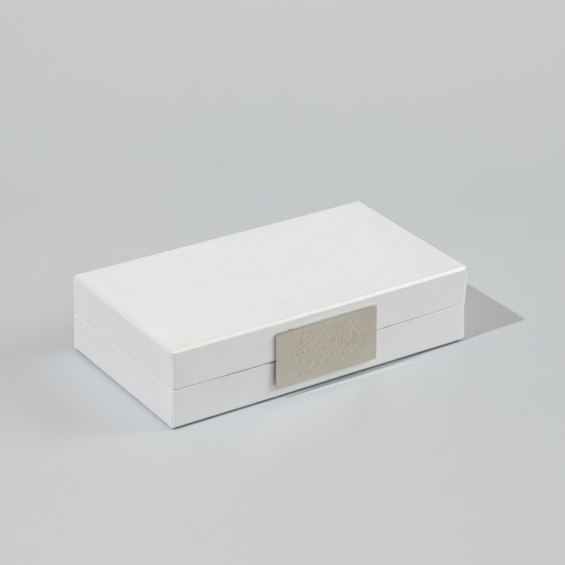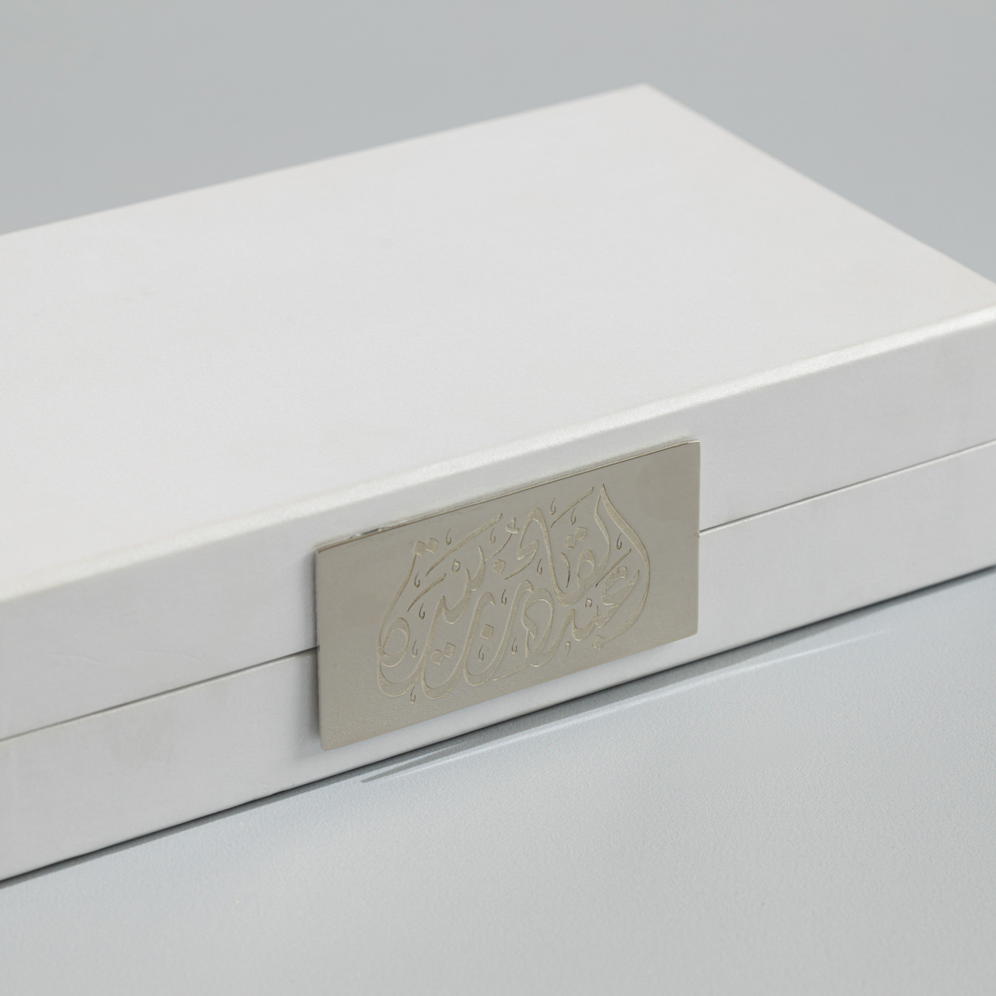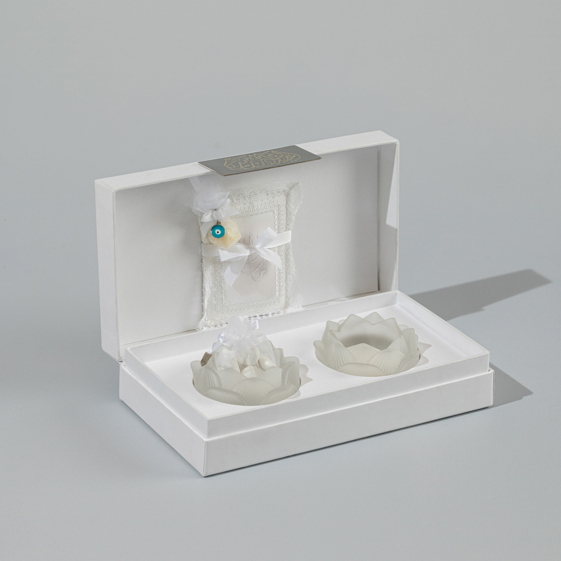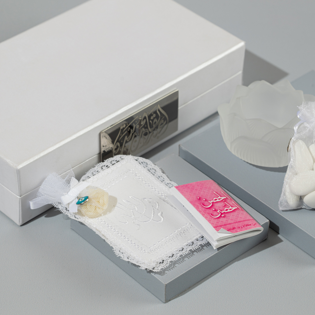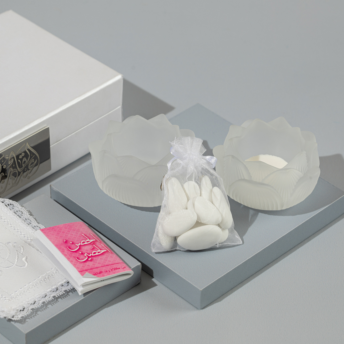 A gift set including two frosted, flower-shaped glass souvenirs, one holding a tea candle and the other holding a bag of sugared almonds, as well as the hosn haseen in an embroidered linen pouch – all in a customized gift box with an engraved name plate