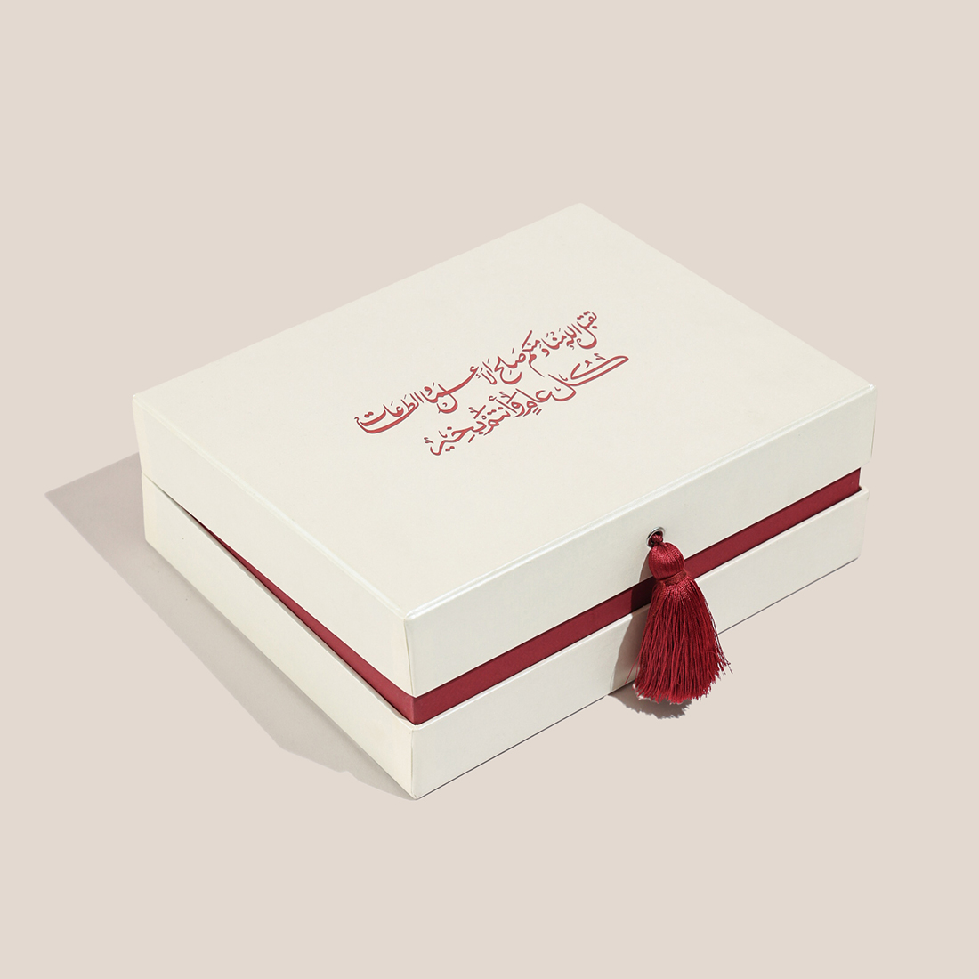 USD55A gift set including the holy Quran with an engraved name plate, pearl worry beads with Ayat Al Kursi engraved, two personalized pieces of chocolate, and a box of sugared almonds – in a customized gift box with a personalized message displayed inside the lid. -