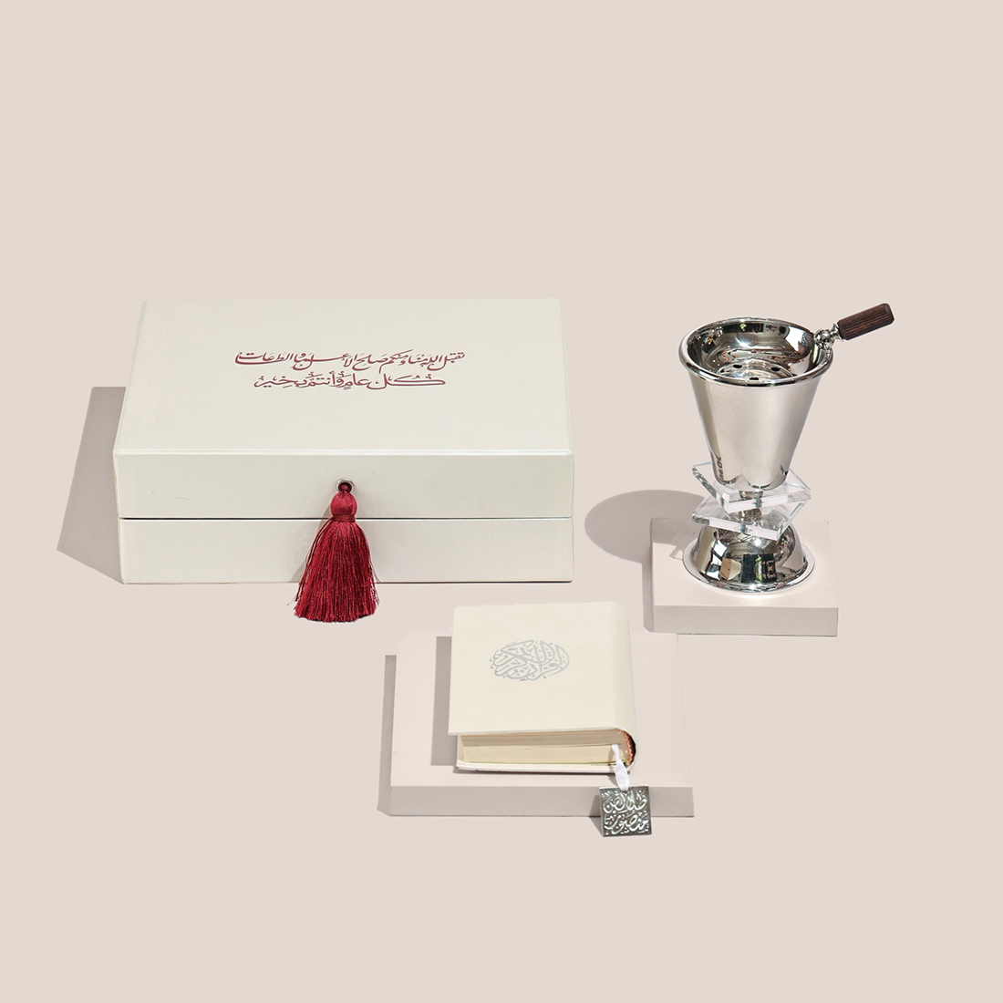 A gift set including a large crystal incense burner and the holy Quran with an engraved name plate – all in a decorated gift box.