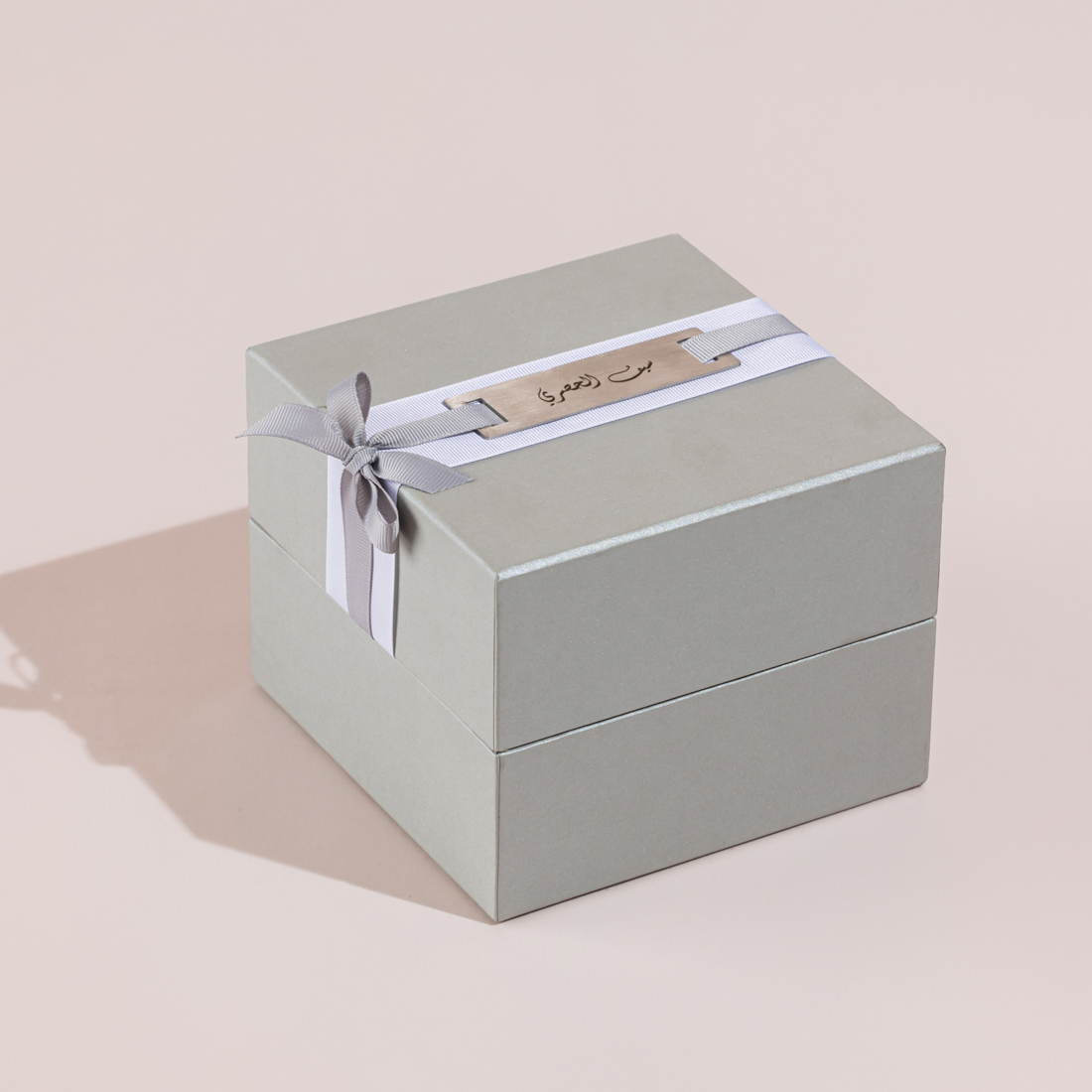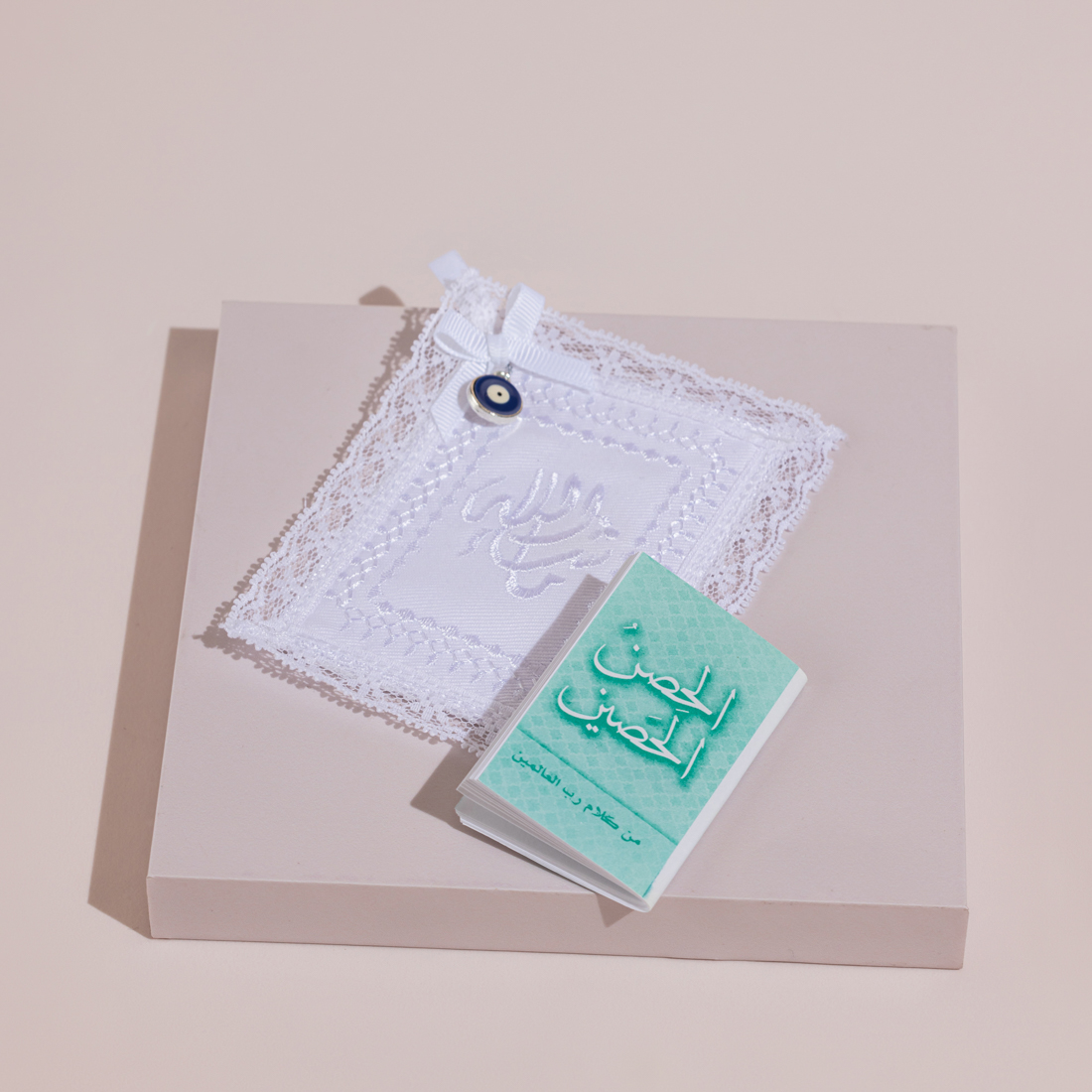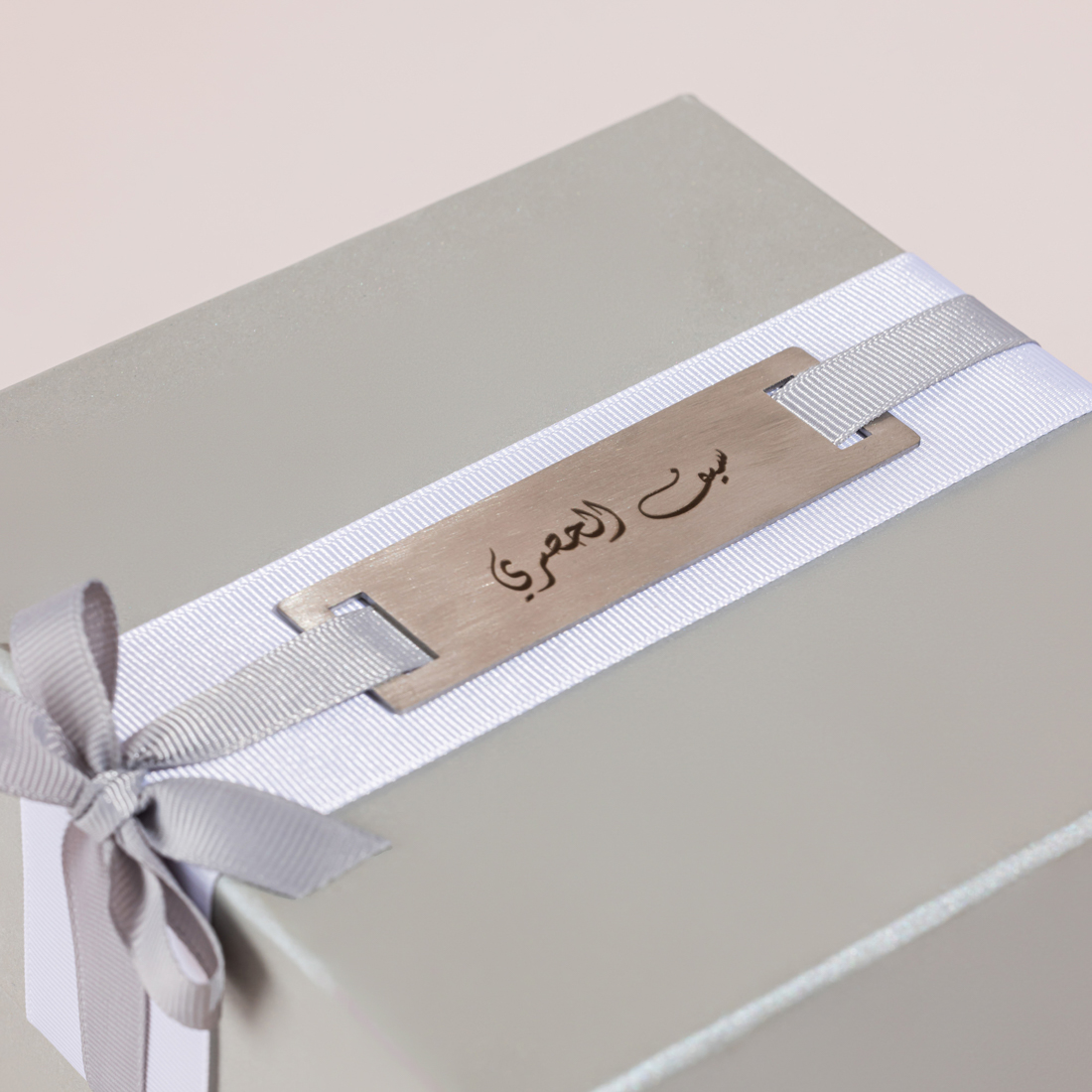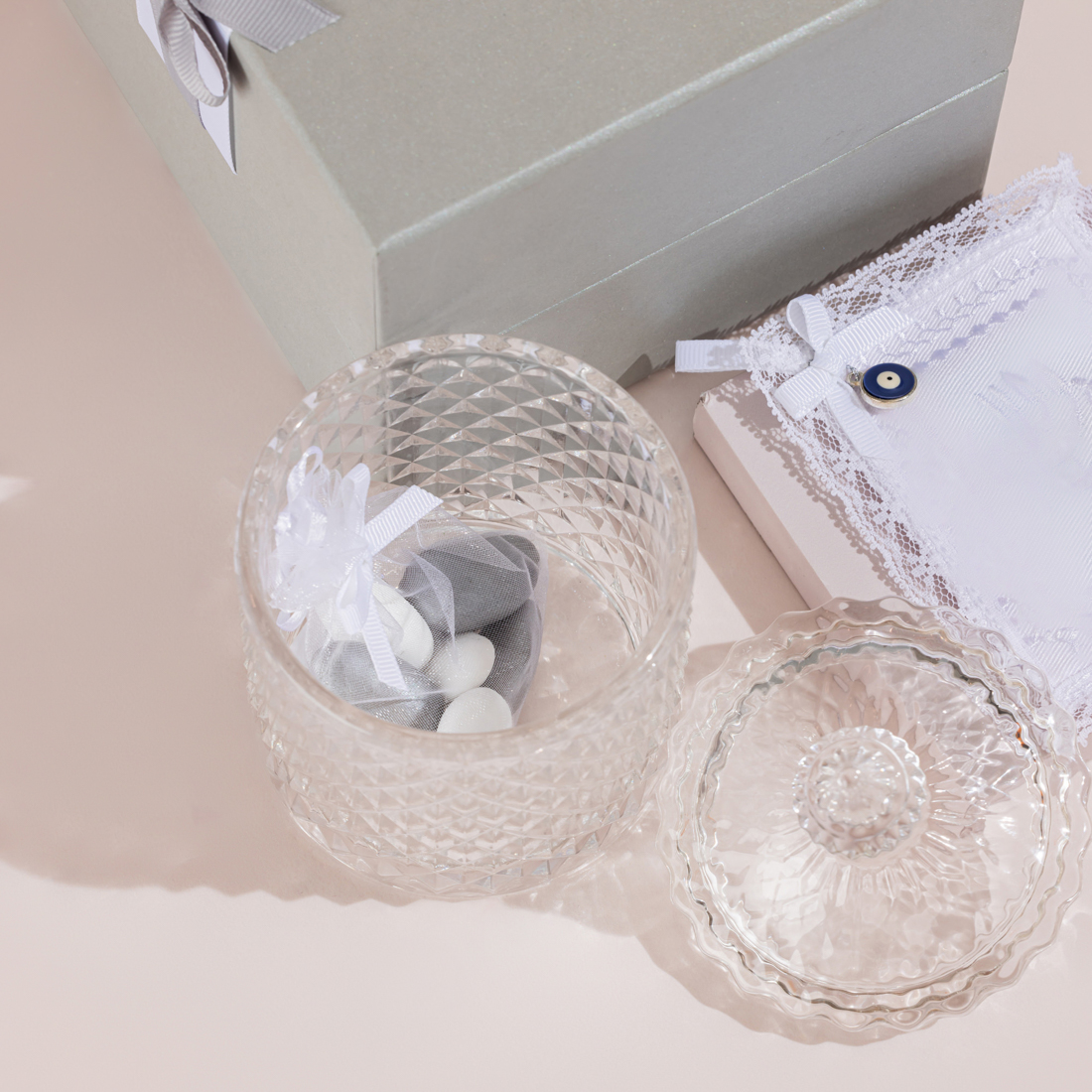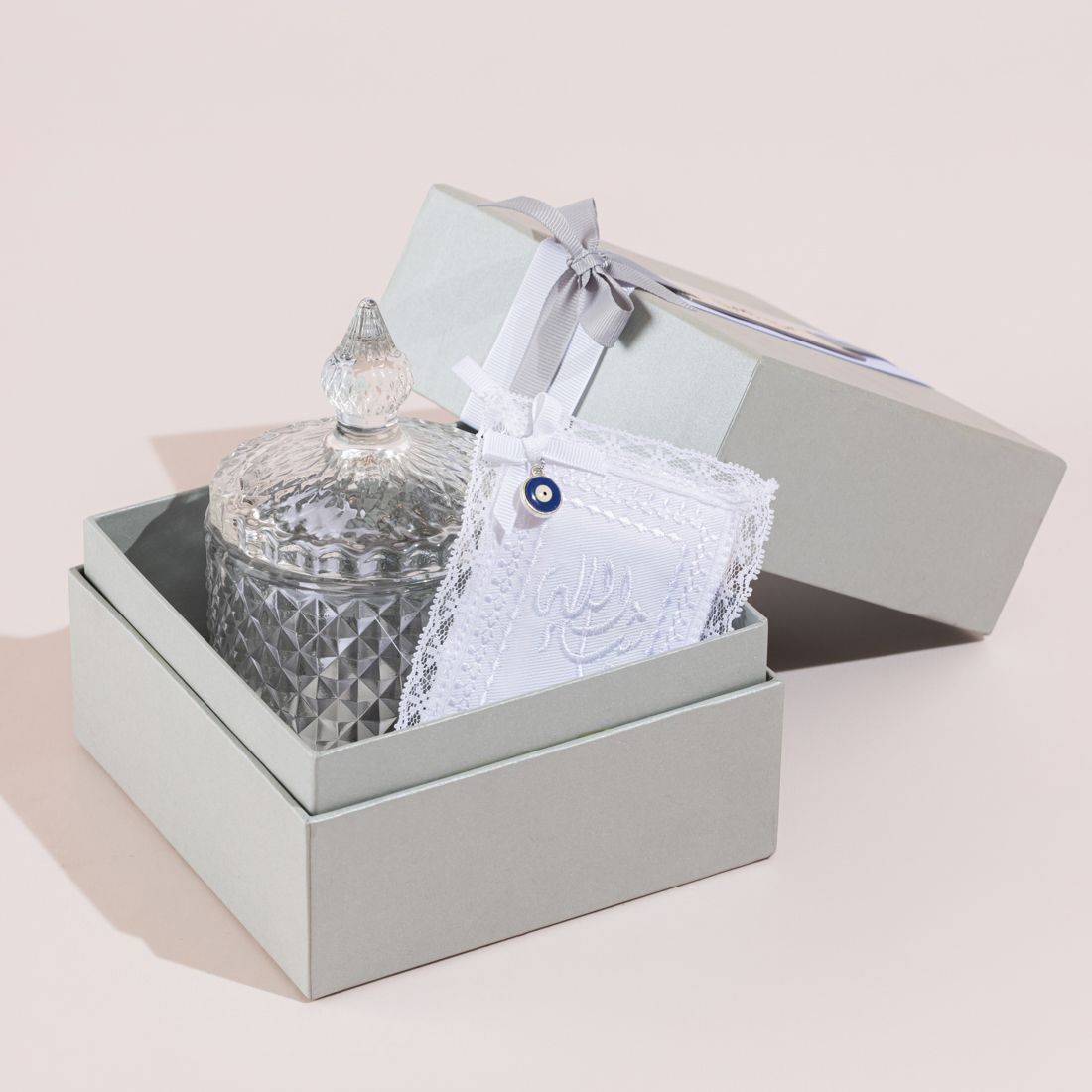 A gift set including a glass bonbonniere with a bag of sugared almonds and the hosn haseen in an embroidered linen pouch, all placed in a customized gift box with an engraved name plate