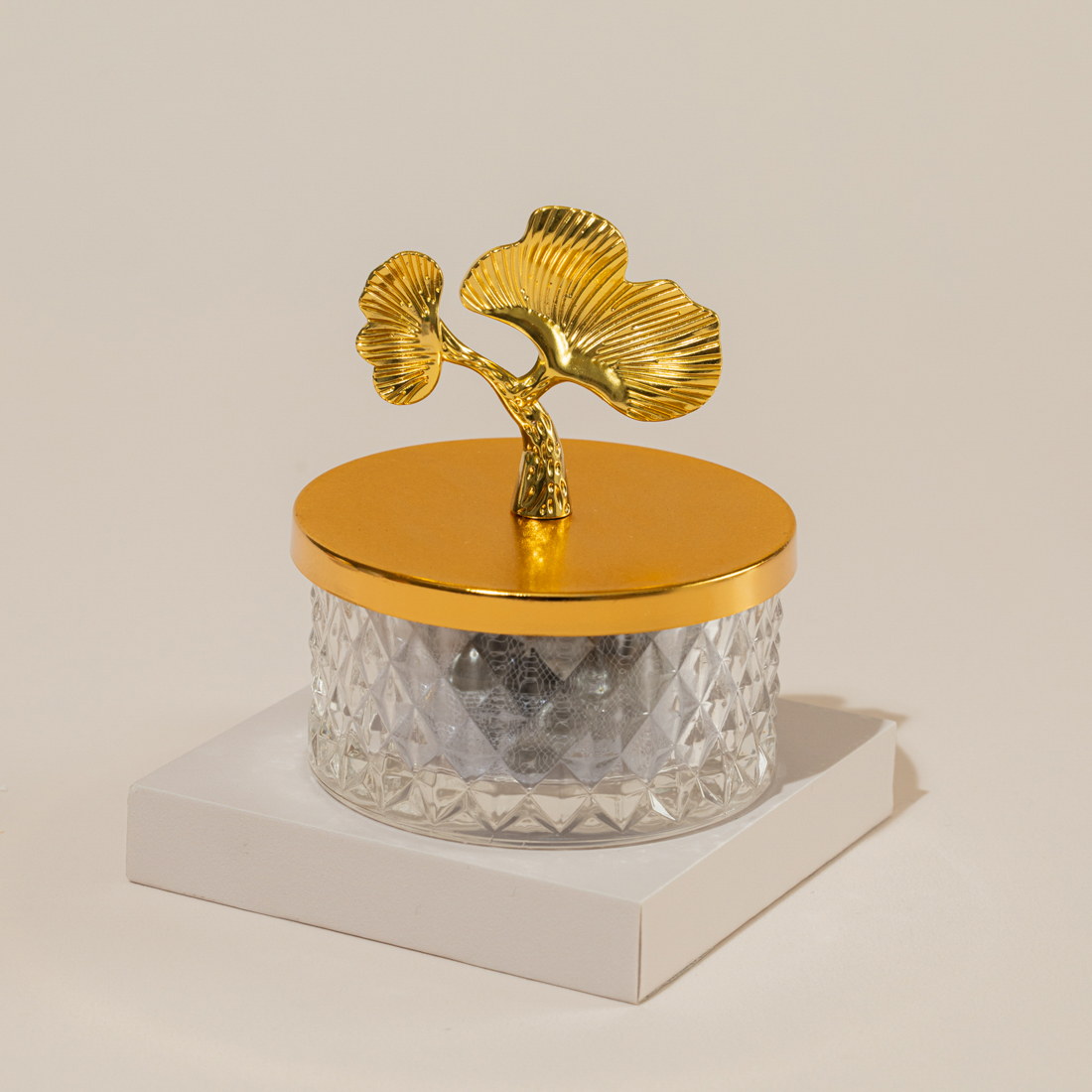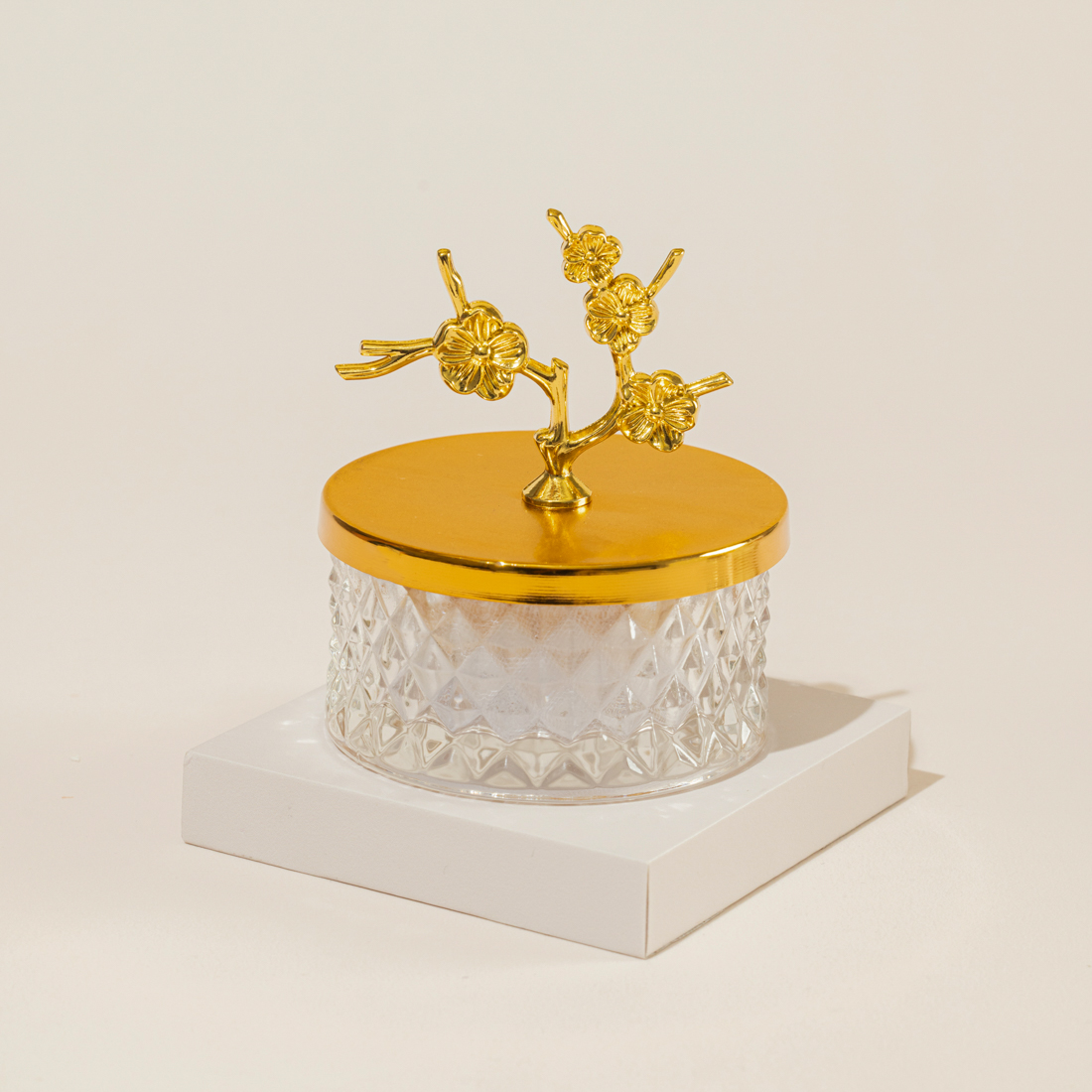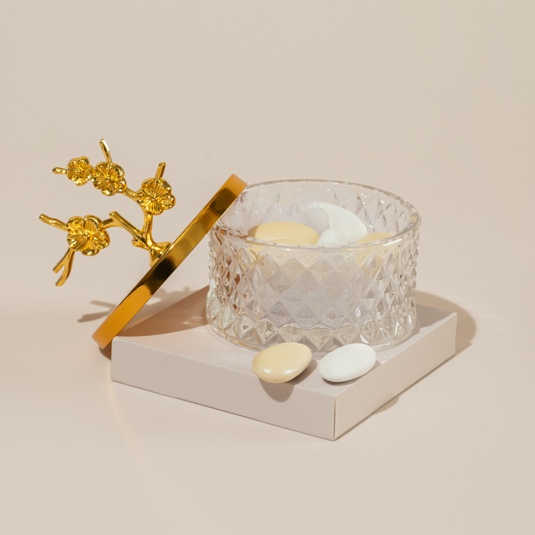 A glass bonbonniere with a metallic cover, filled with sugared almonds and placed in a decorated linen pouch