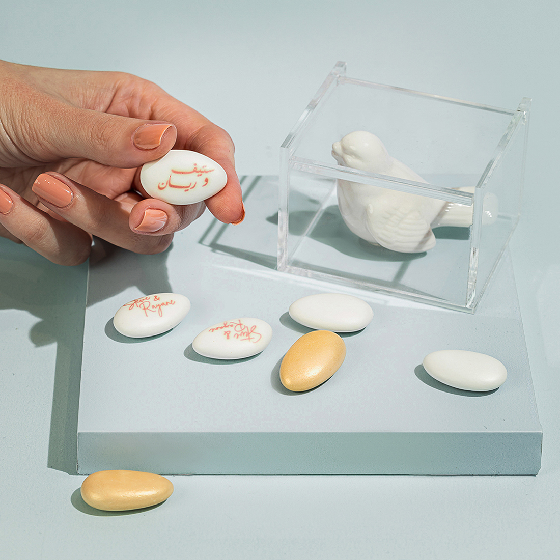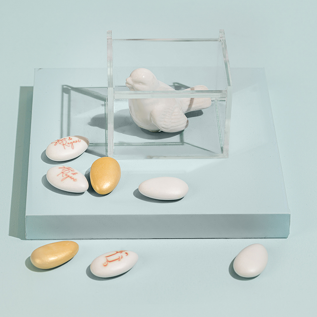 A decorated box holding a ceramic bird and personalized sugared almonds