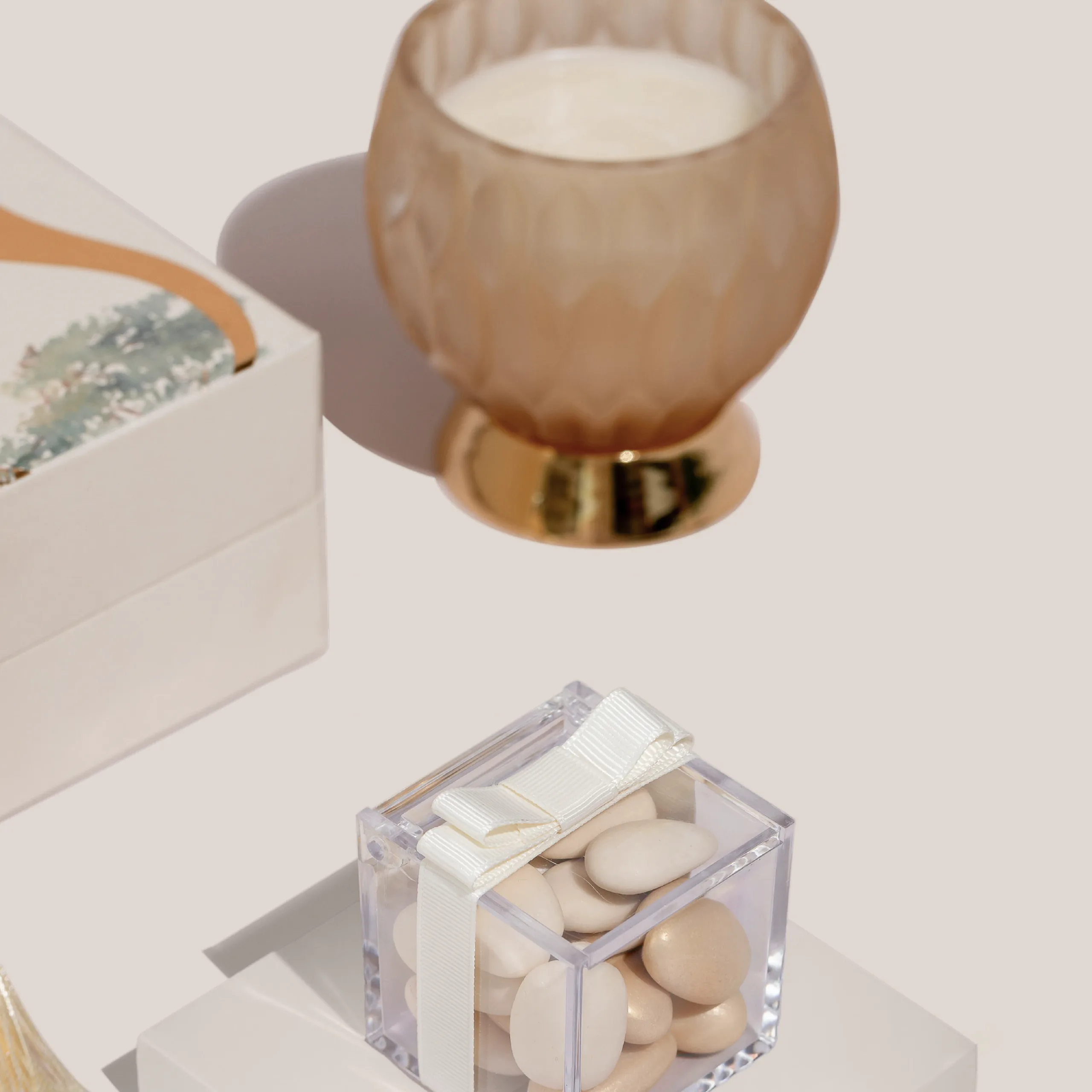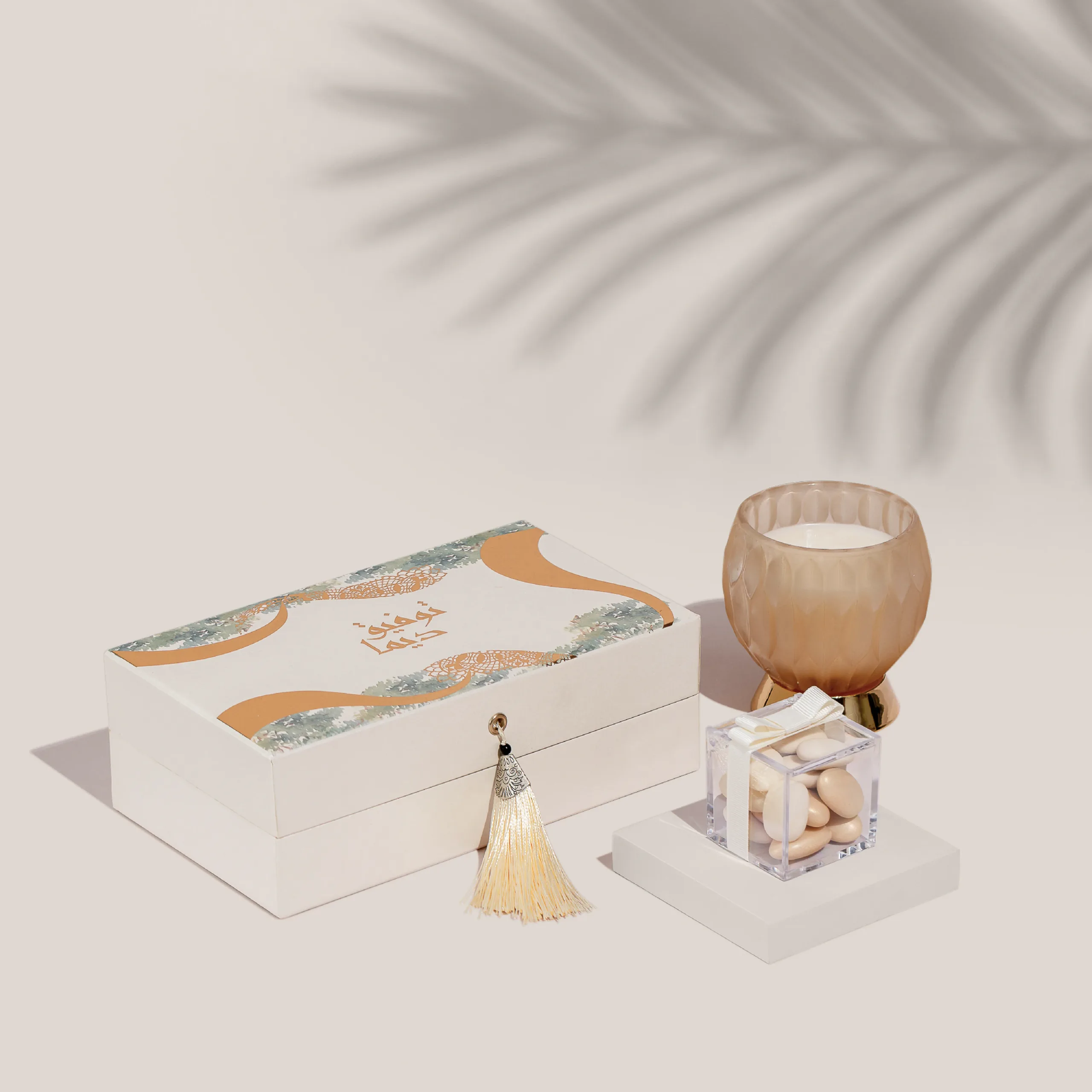 A personalized gift box with a tassel, featuring a scented glass candle and a box of sugared almonds.