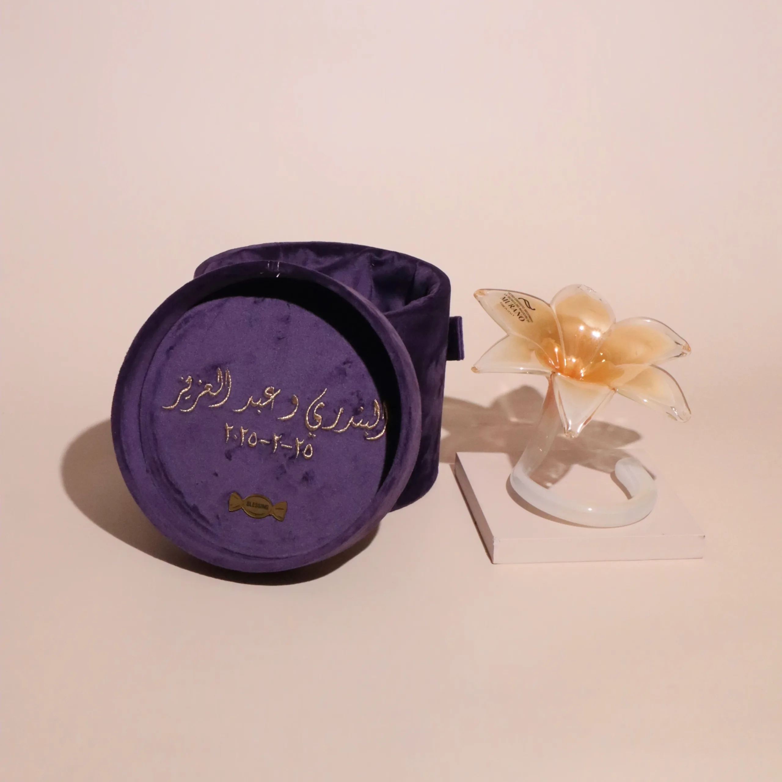 USD80A Murano glass candle presented in a customized gift box with an engraved nameplate and a drawer filled with personalized chocolate. -