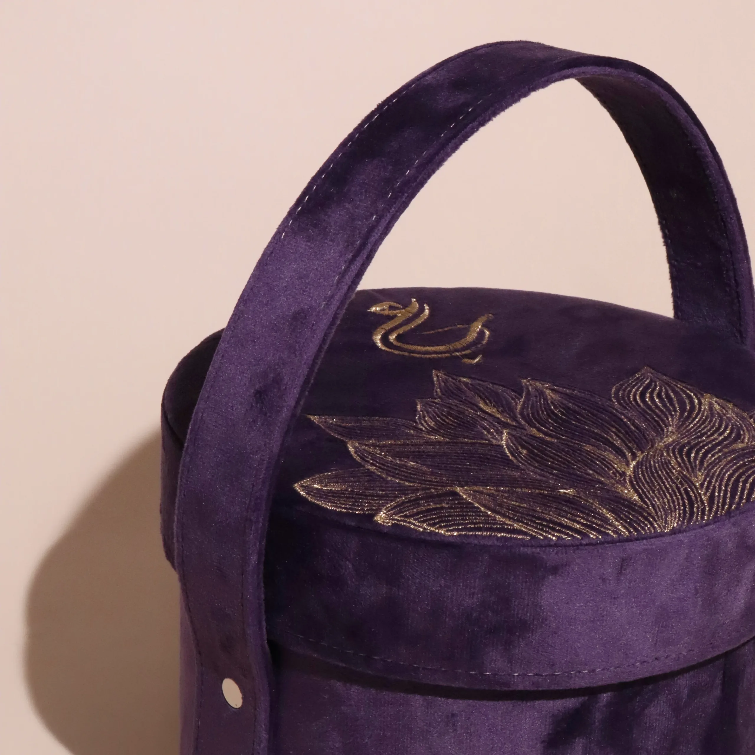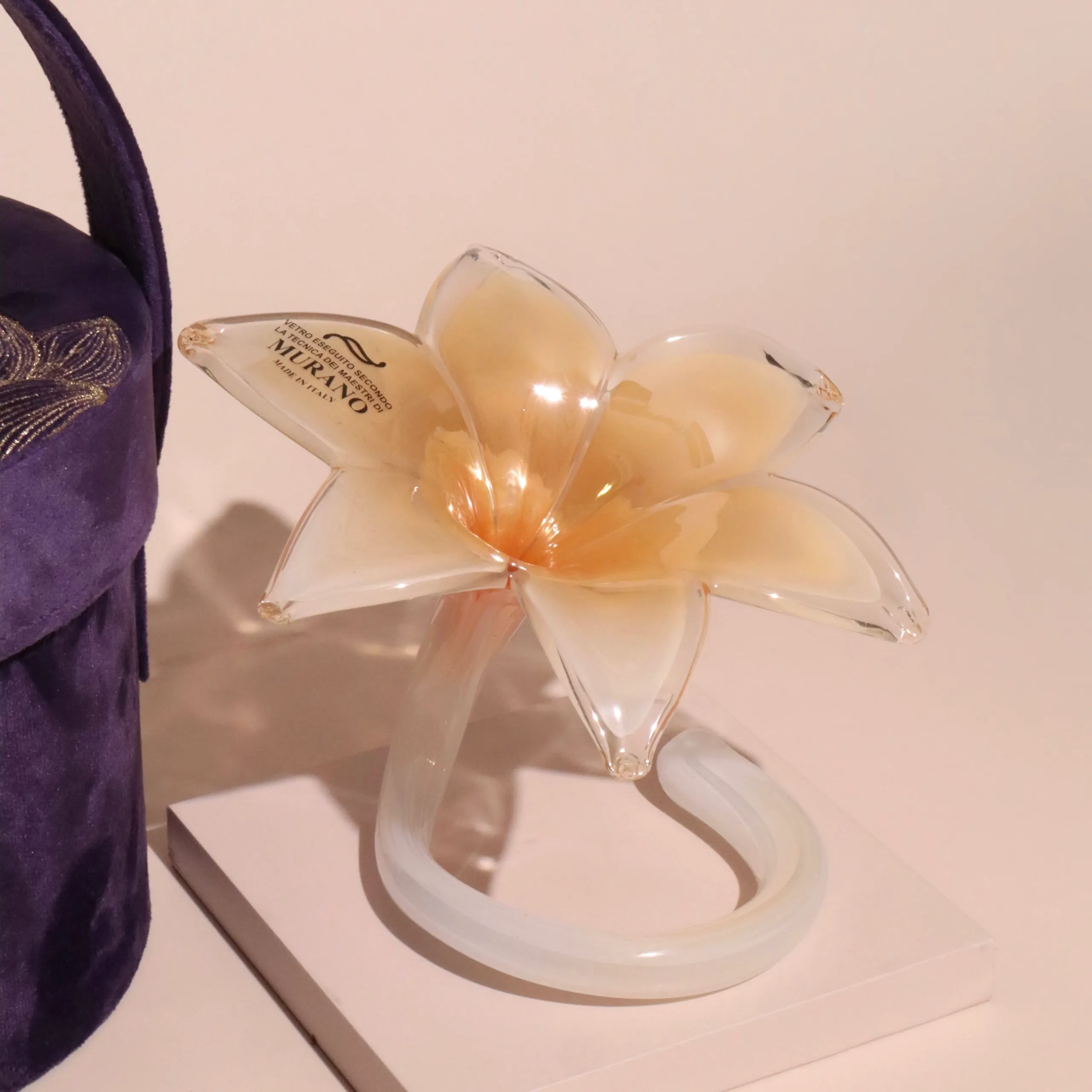 A Murano glass flower in an embroidered velvet box with a matching handle.