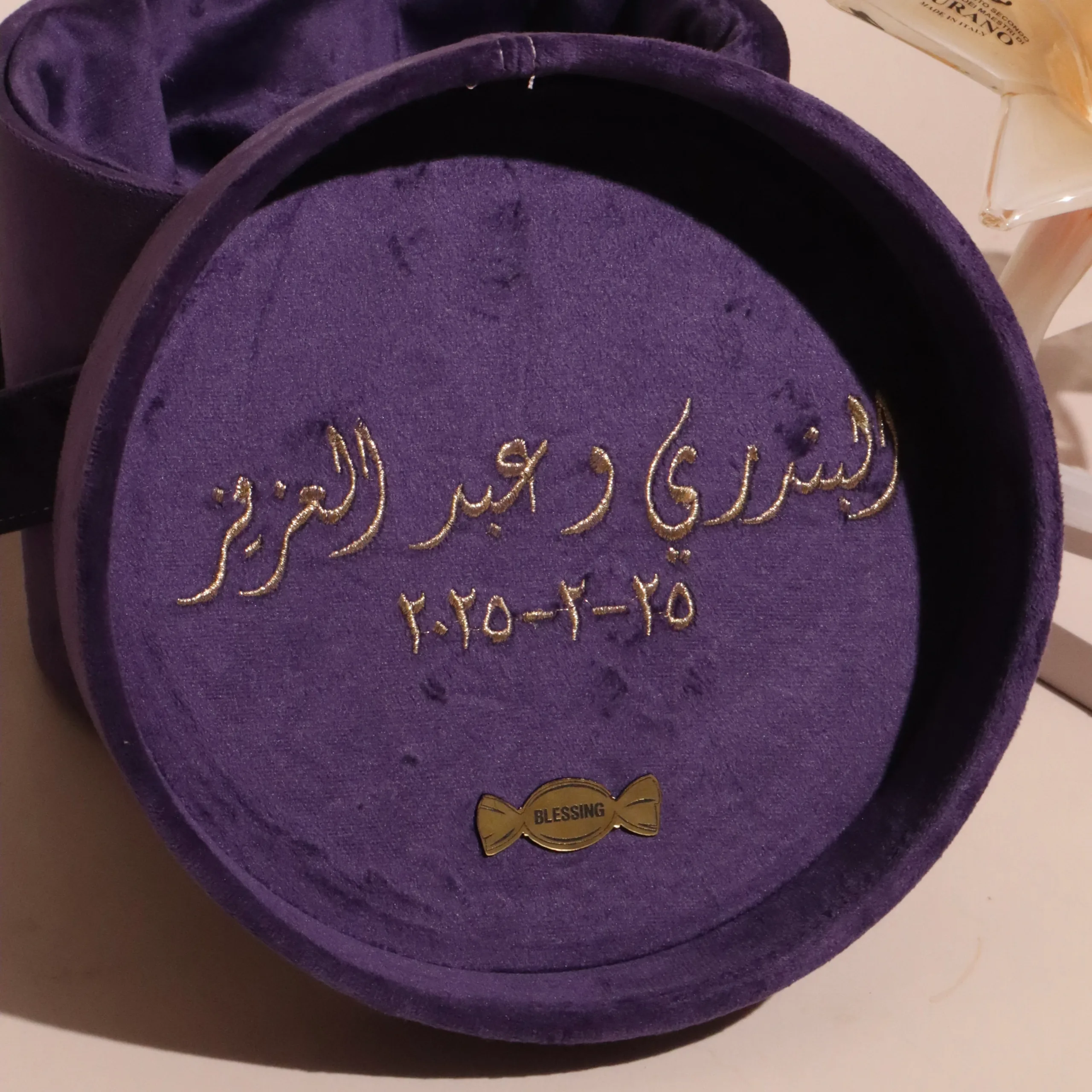 USD55A gift set including the holy Quran with an engraved name plate, pearl worry beads with Ayat Al Kursi engraved, two personalized pieces of chocolate, and a box of sugared almonds – in a customized gift box with a personalized message displayed inside the lid. -
