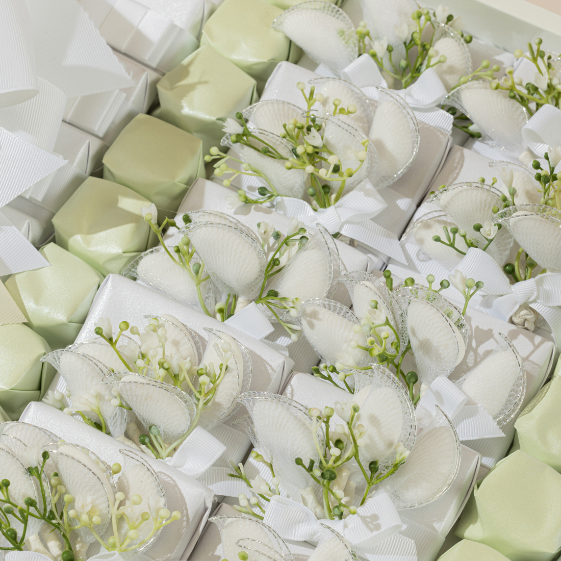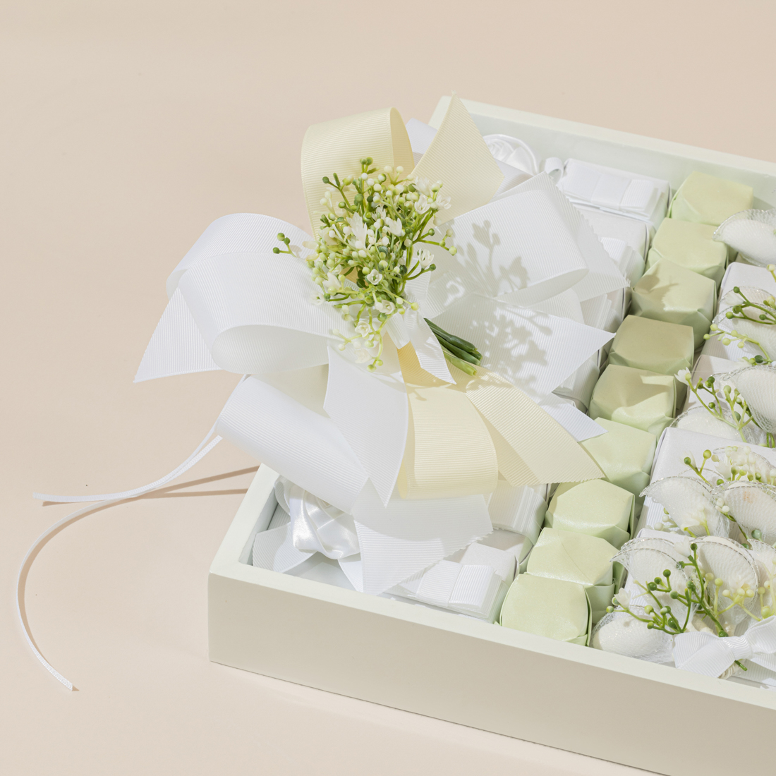 A decorated, wooden tray with handles holding 1.45 kg of double wrapped and decorated assorted chocolate, as well as 0.125 kg of sugared almonds