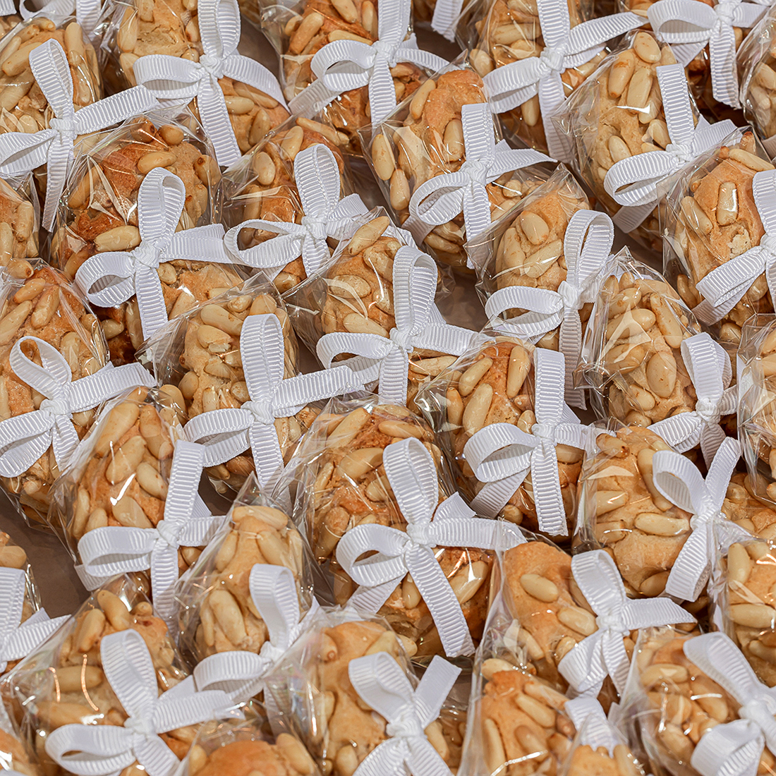 A decorated, silver tray with handles holding 2.5 kg of wrapped biscuits with pine nut paste, rose water and pine nuts