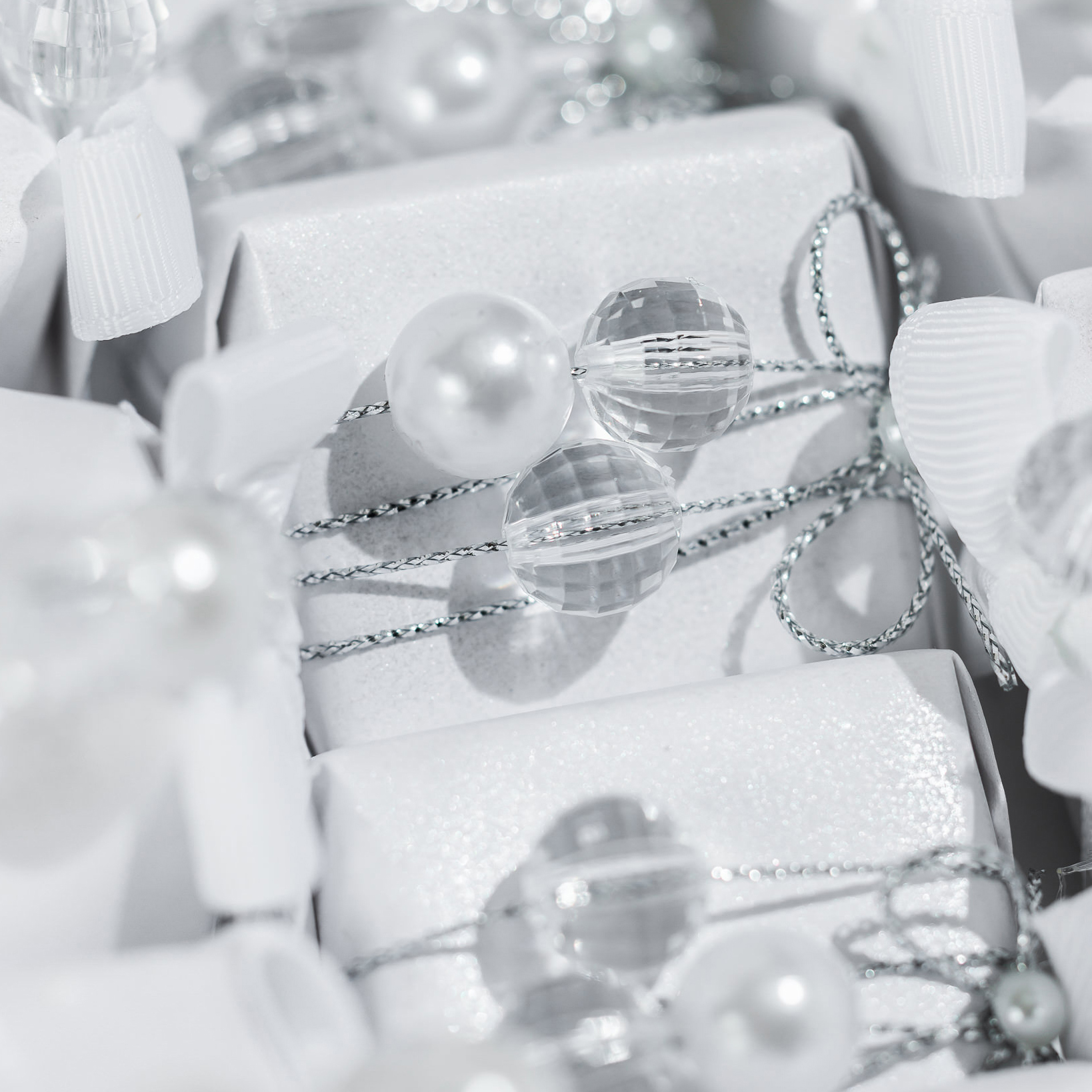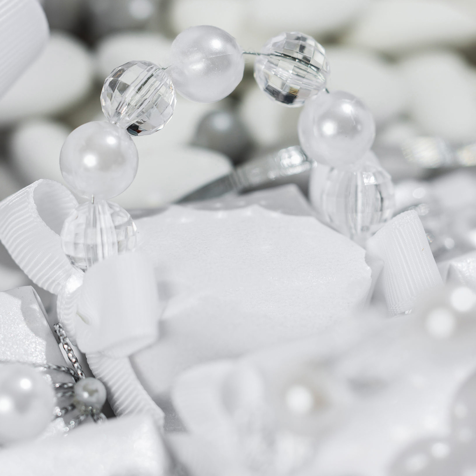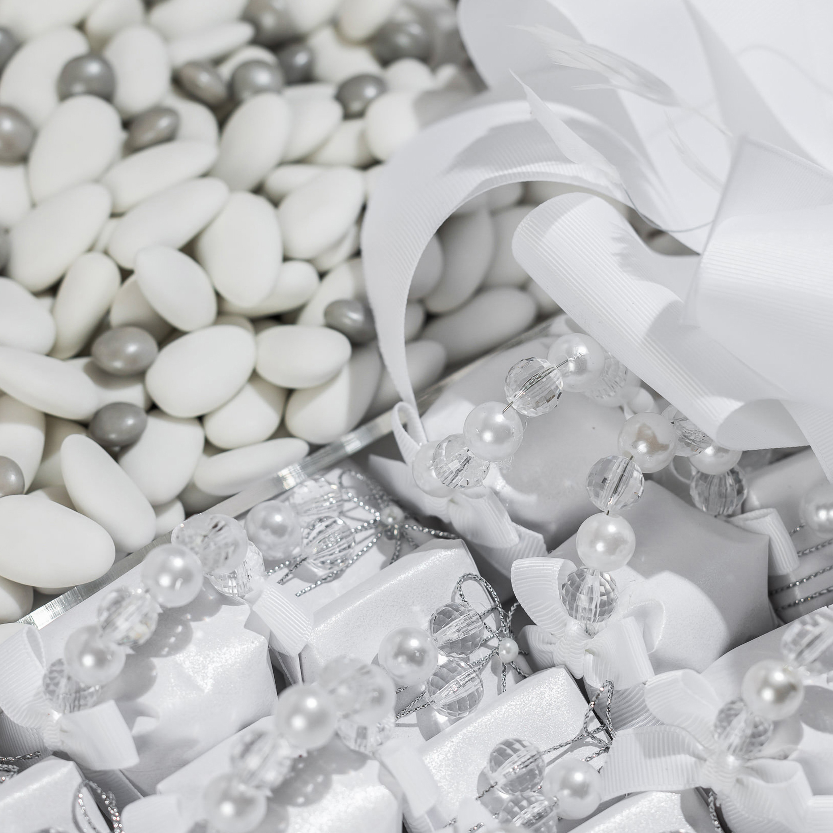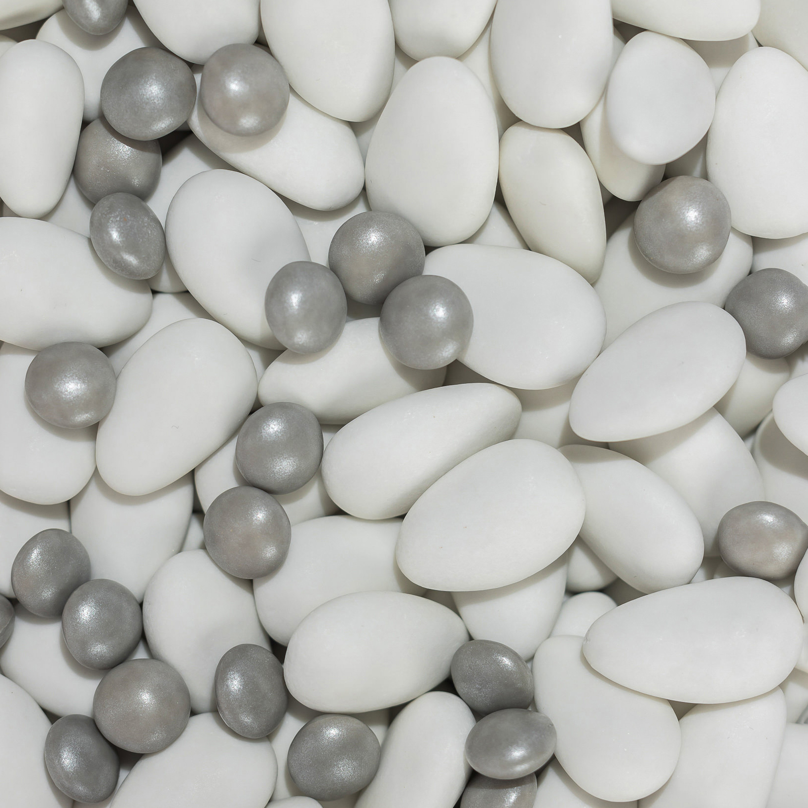 A decorated, silver tray with handles holding 1.2 kg of decorated assorted chocolate with pearls and beads, as well as 1 kg of sugared almonds and crispy chocolate dragées