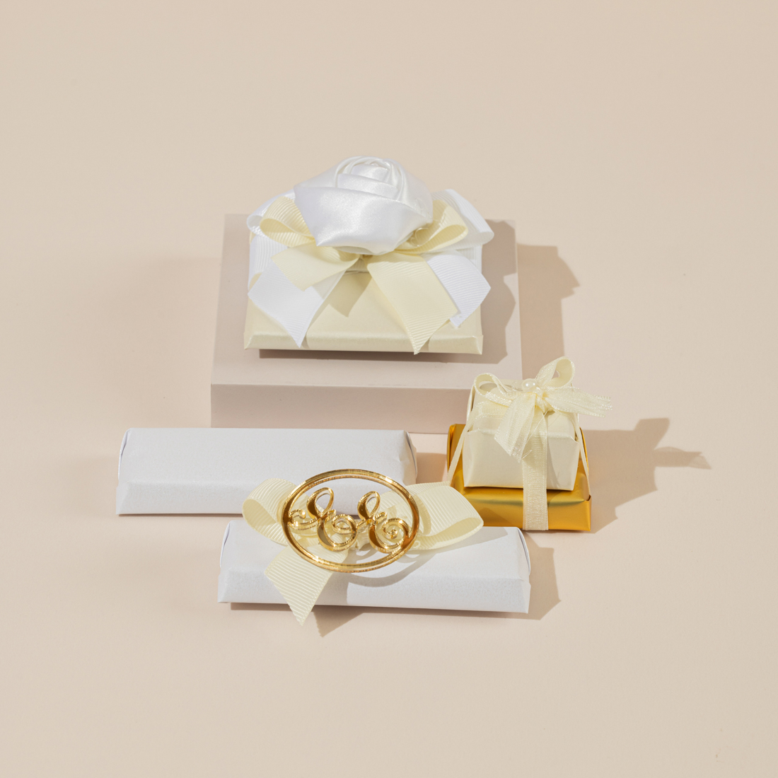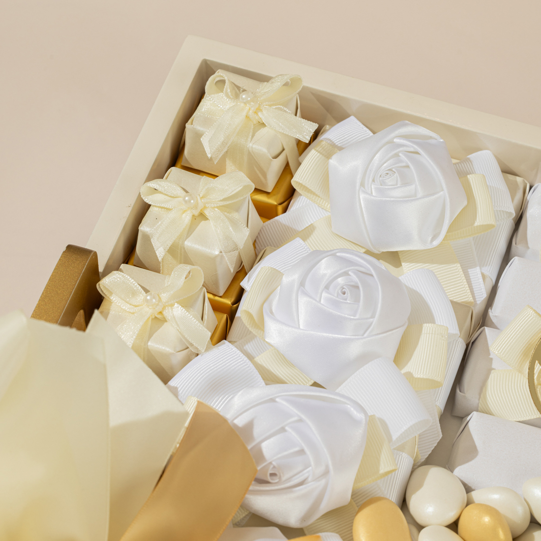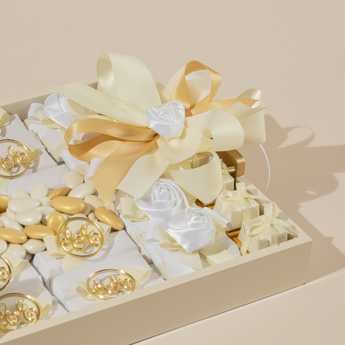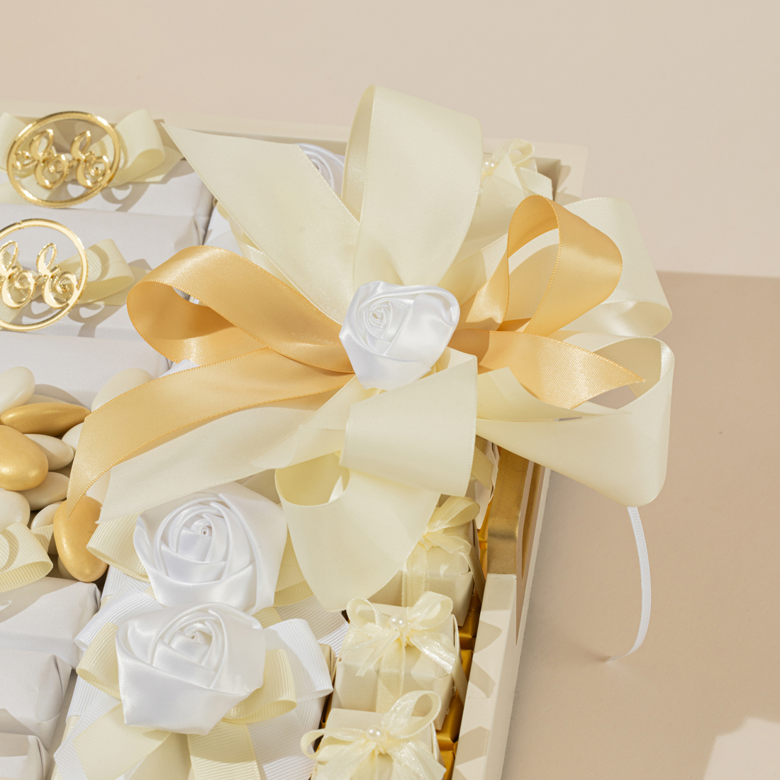 A decorated, wooden tray with handles holding 1.2 kg of double wrapped and decorated assorted chocolate, as well as 0.4 kg of sugared almonds