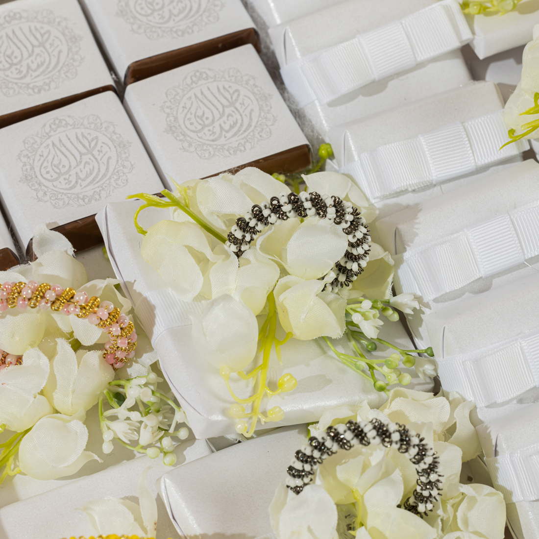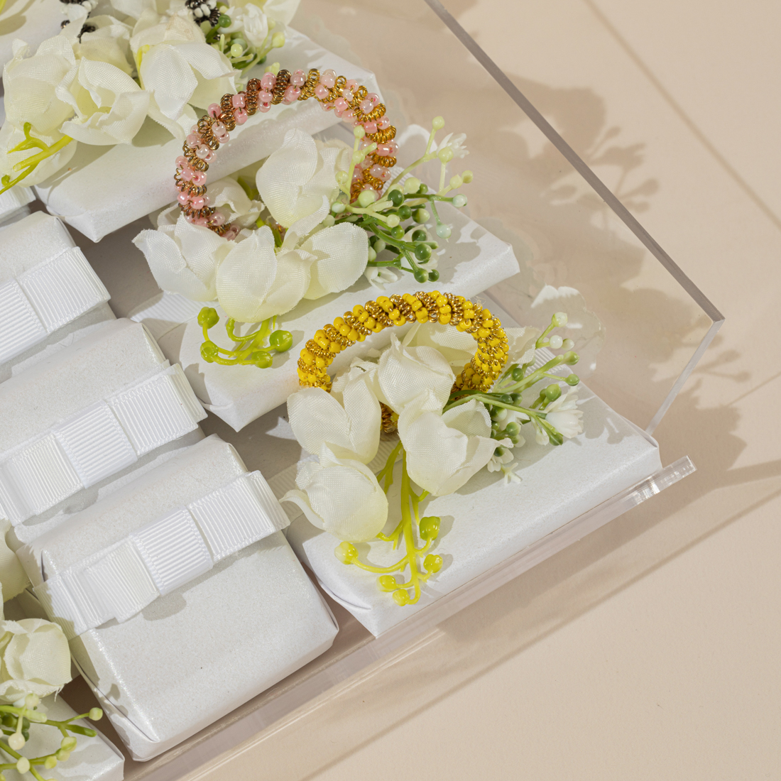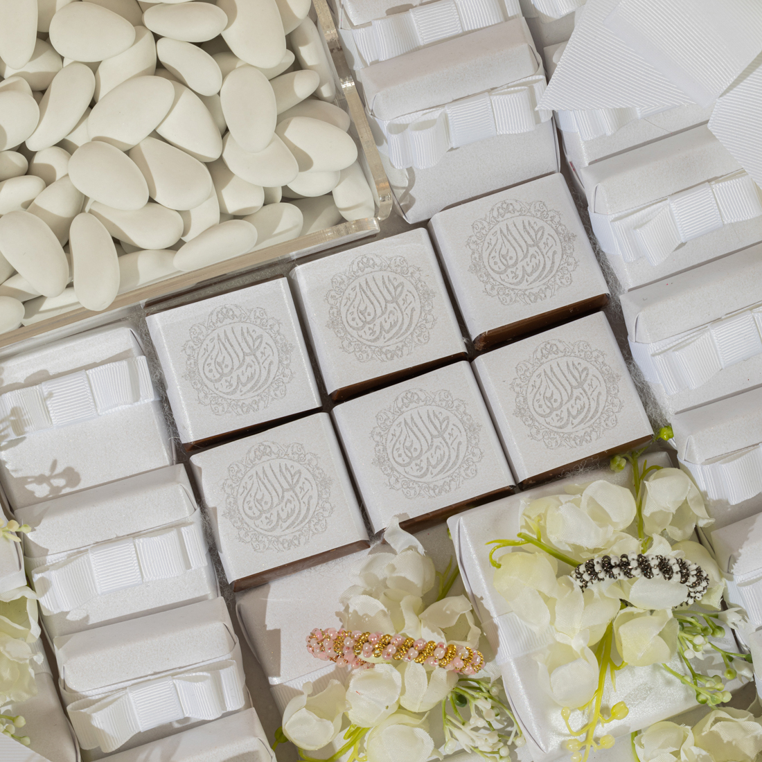 A decorated, plexi tray holding 1.2 kg of double wrapped, printed and decorated assorted chocolate, as well as 0.5 kg of white sugared almonds