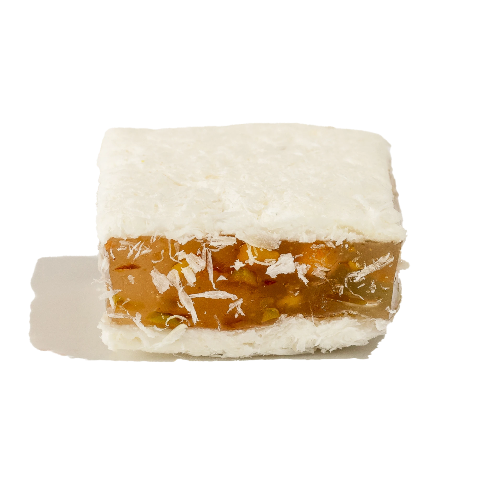 A confection filled with grilled pistachios and covered with coconut