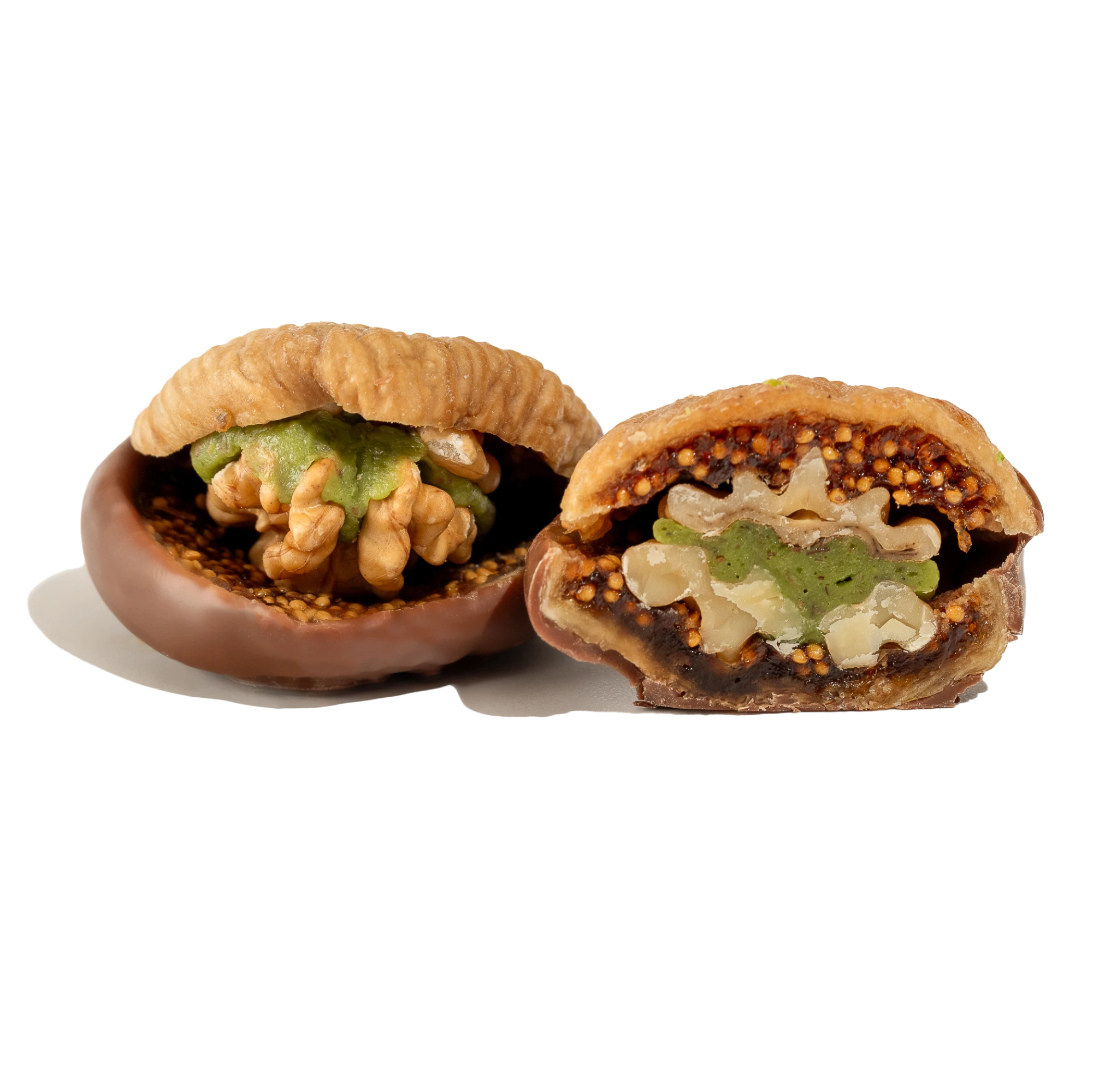 Dried figs with milk chocolate, pistachio paste and walnuts