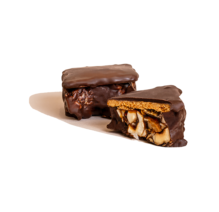 Dark chocolate with carob molasses, cookies and crushed hazelnuts
