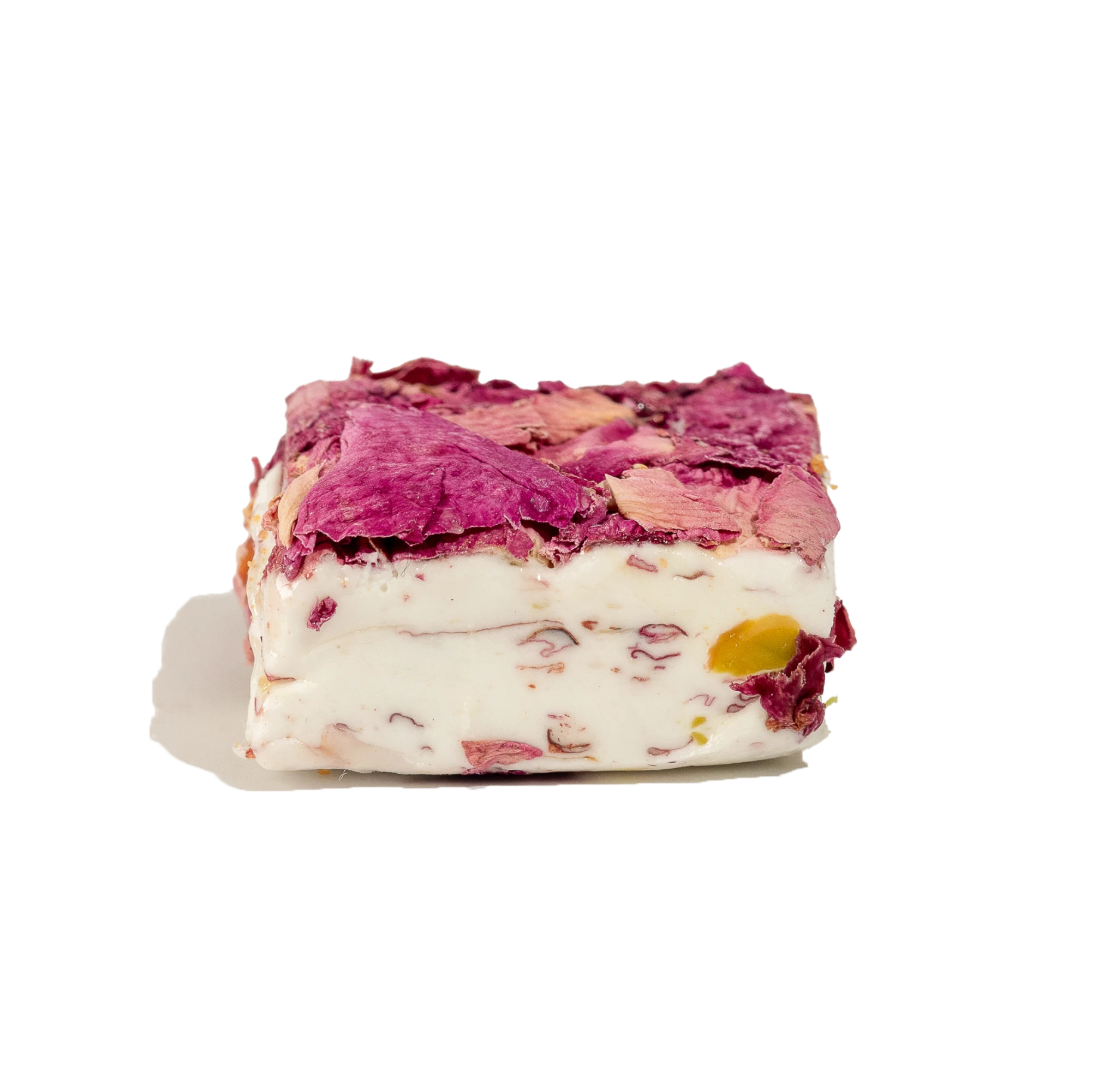 White nougat with chopped pistachios and topped with a layer of dried flower petals